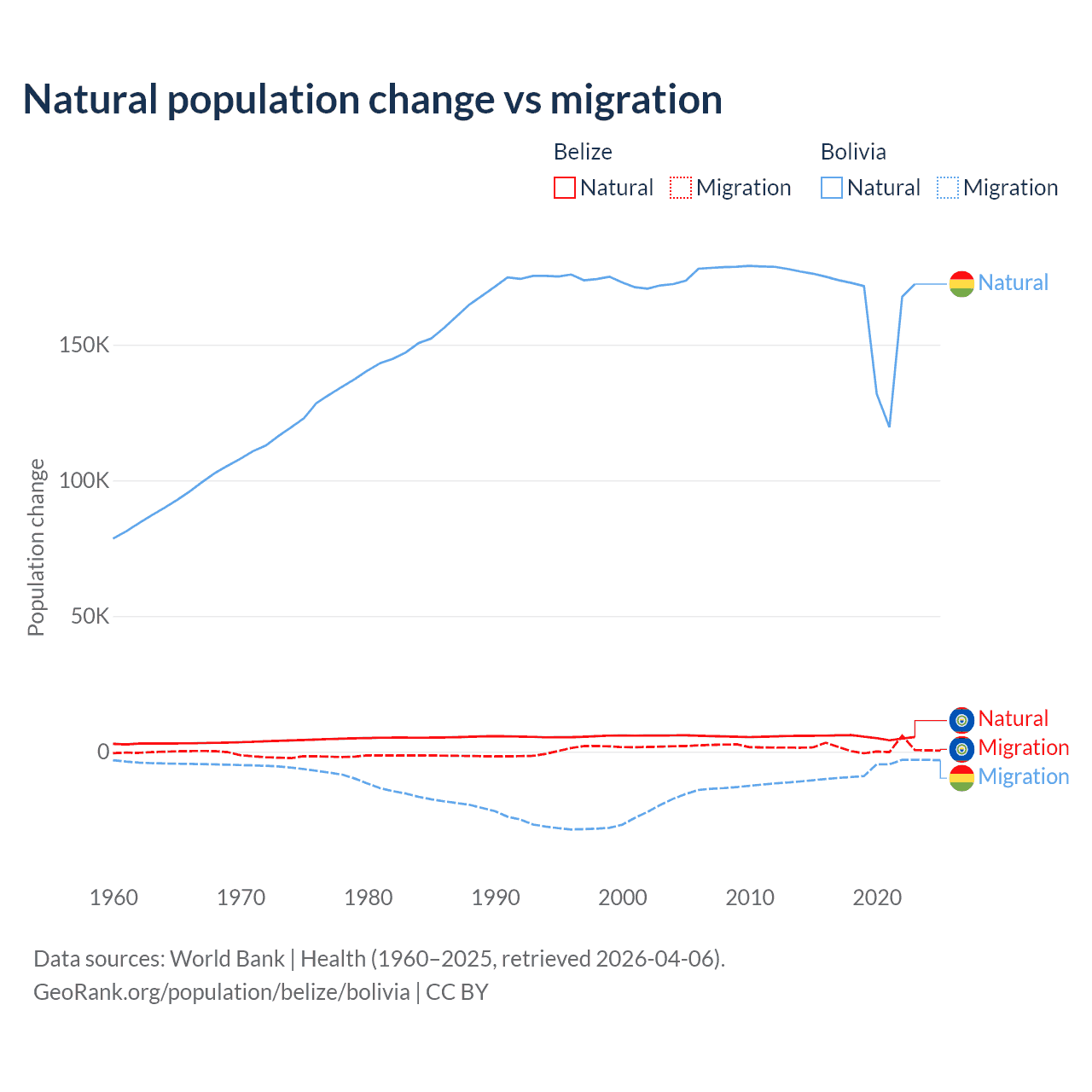 Over the last 10 years, 79.6% of the population change in Belize is from natural causes (a gain of 54,754 people) and 20.4% is from migration (a gain of 14,073 people). In Bolivia 95.6% is from natural causes (a gain of 1,637,833 people) and 4.37% is from migration (a loss of 74,903 people).