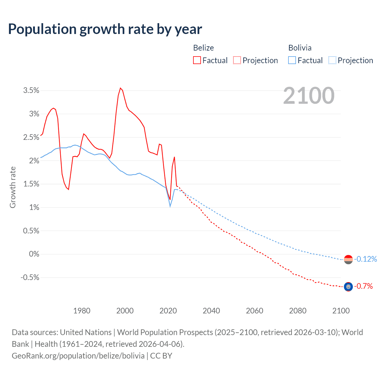 Data sources: World Bank | Health (1960–2024, retrieved 2026-04-06); United Nations | World Population Prospects (1960–2026, retrieved 2026-03-10); U.S. Census Bureau (1960–2025, retrieved 2026-02-08); Central Intelligence Agency (CIA) (2000–2019, retrieved 2026-02-20).