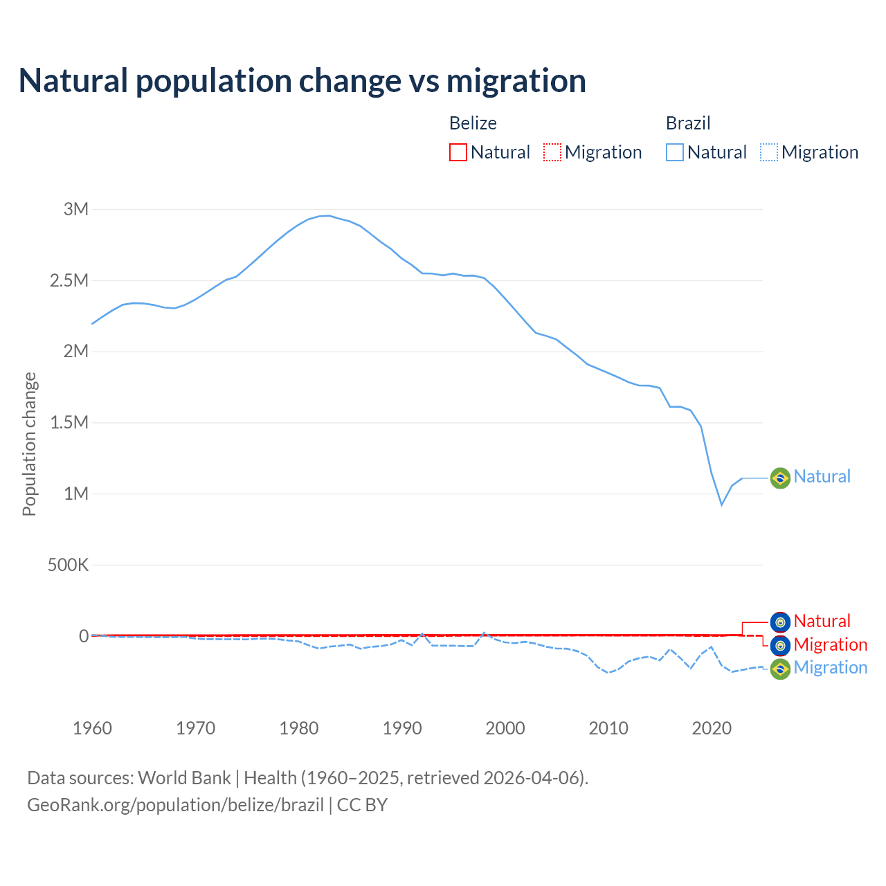 Over the last 10 years, 79.6% of the population change in Belize is from natural causes (a gain of 54,754 people) and 20.4% is from migration (a gain of 14,073 people). In Brazil 89.1% is from natural causes (a gain of 14,004,164 people) and 10.9% is from migration (a loss of 1,708,894 people).