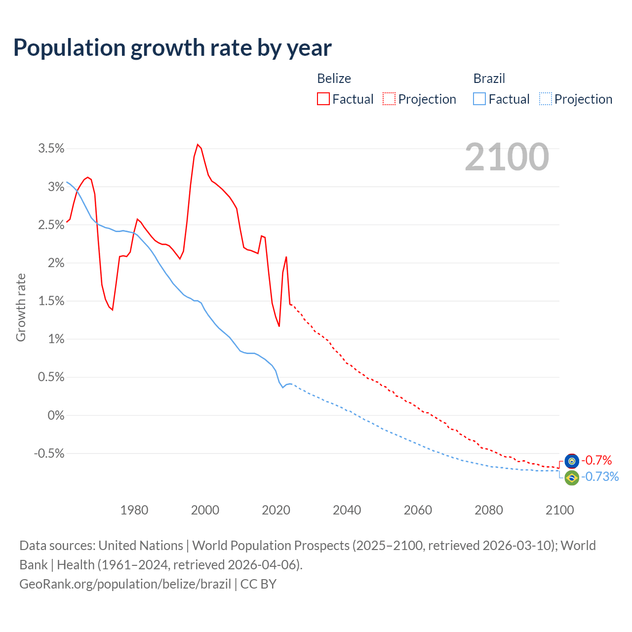 - For the last 10 years, Belize has had an average growth rate of +1.83% per year vs +0.6% in Brazil.