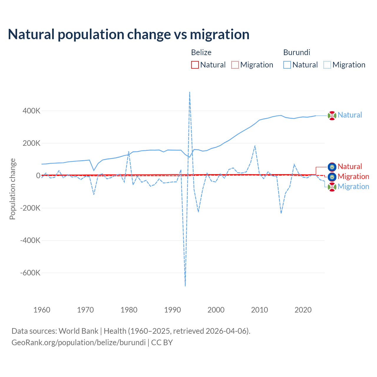 Over the last 10 years, 79.6% of the population change in Belize is from natural causes (a gain of 54,754 people) and 20.4% is from migration (a gain of 14,073 people). In Burundi 91% is from natural causes (a gain of 3,614,502 people) and 9.03% is from migration (a loss of 358,928 people).