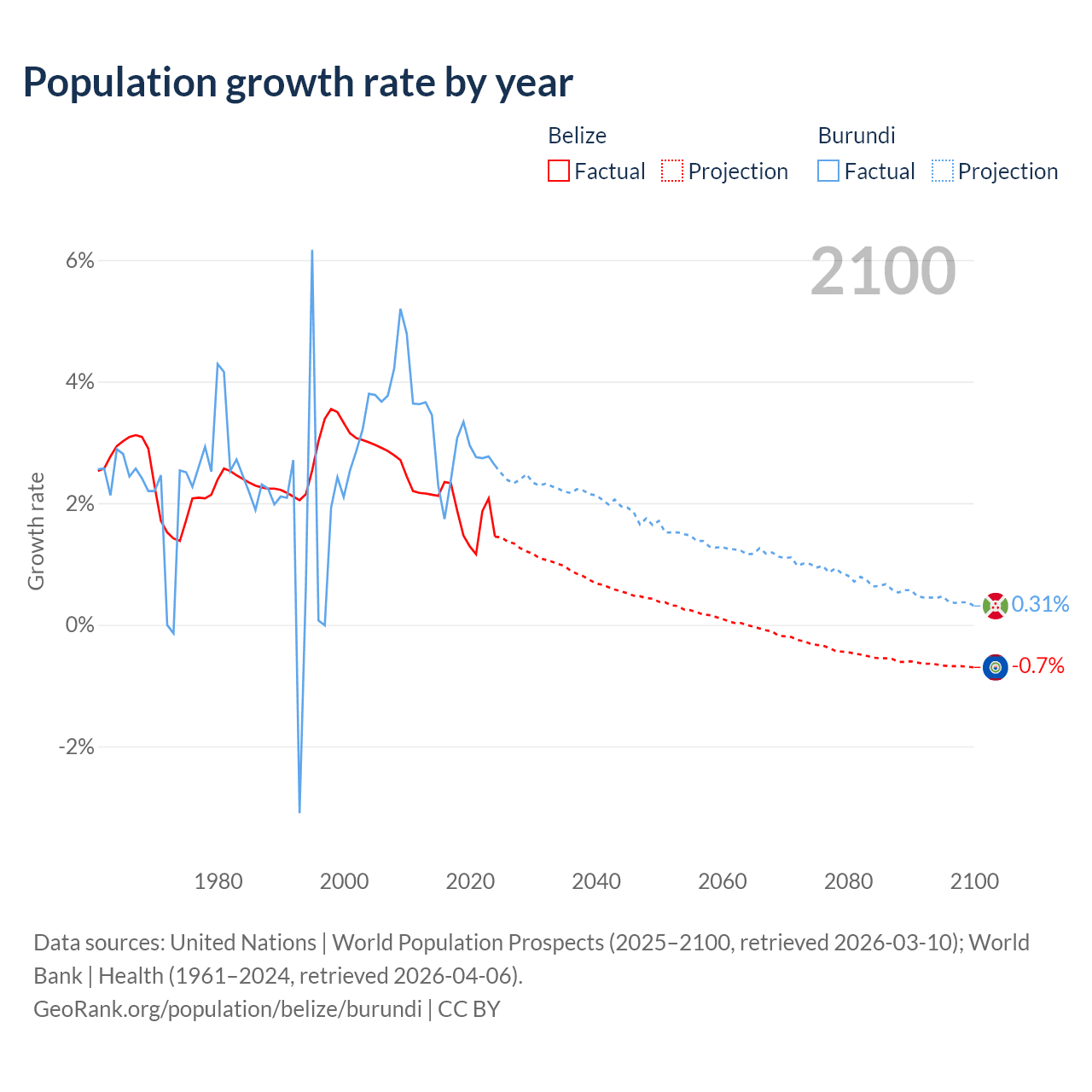 - For the last 10 years, Belize has had an average growth rate of +1.83% per year vs +2.74% in Burundi.