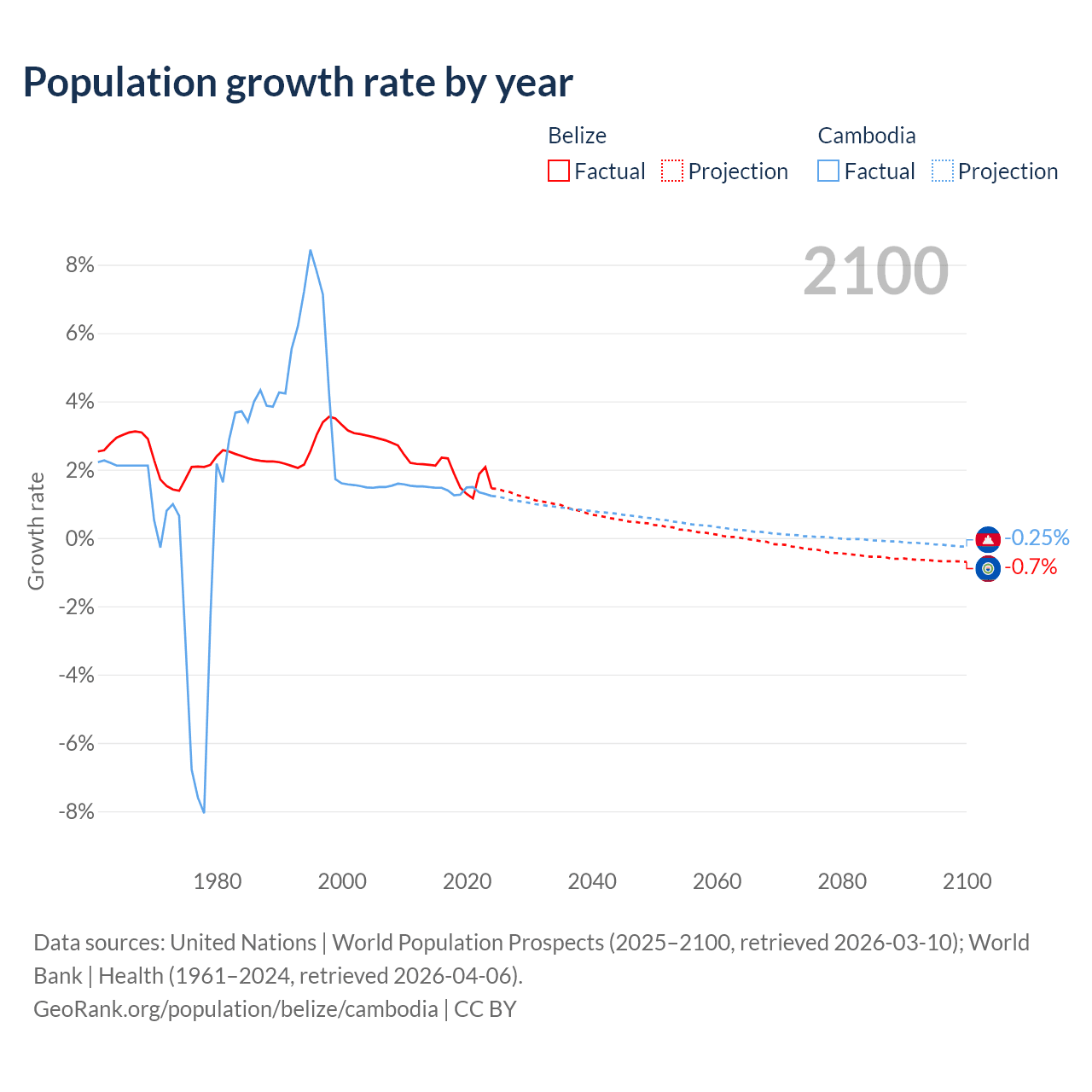 - For the last 10 years, Belize has had an average growth rate of +1.83% per year vs +1.38% in Cambodia.