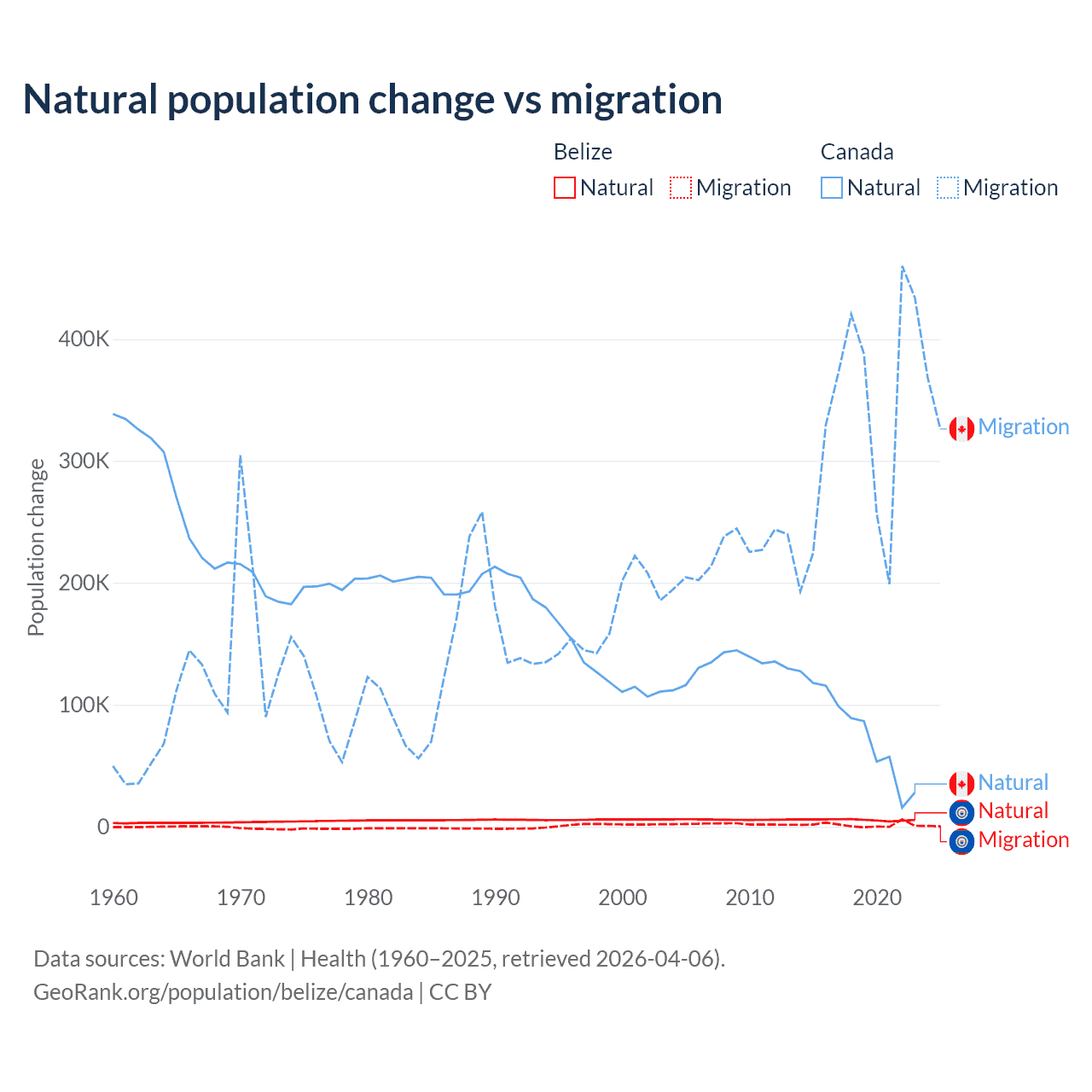 Over the last 10 years, 79.6% of the population change in Belize is from natural causes (a gain of 54,754 people) and 20.4% is from migration (a gain of 14,073 people). In Canada 19.4% is from natural causes (a gain of 789,345 people) and 80.6% is from migration (a gain of 3,276,554 people).