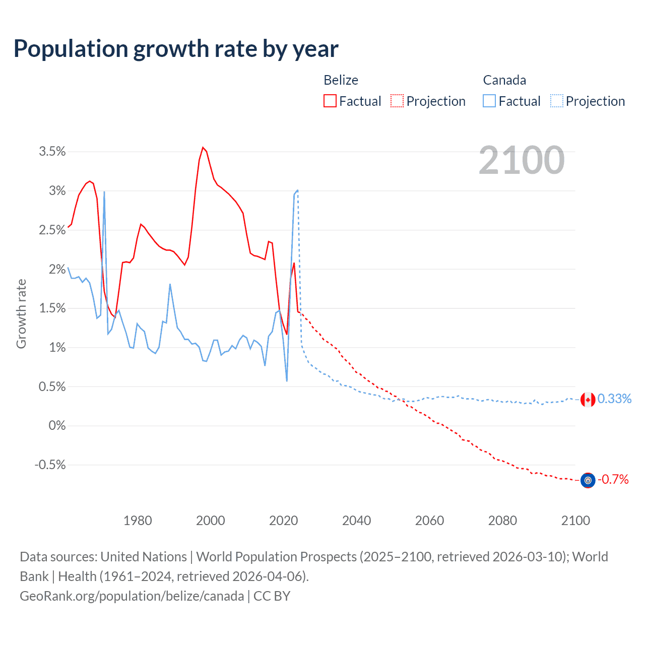 - For the last 10 years, Belize has had an average growth rate of +1.83% per year vs +1.5% in Canada.