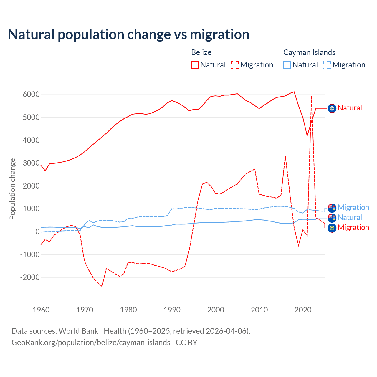 Over the last 10 years, 79.6% of the population change in Belize is from natural causes (a gain of 54,754 people) and 20.4% is from migration (a gain of 14,073 people). In the Cayman Islands 31.1% is from natural causes (a gain of 4,468 people) and 68.9% is from migration (a gain of 9,879 people).
