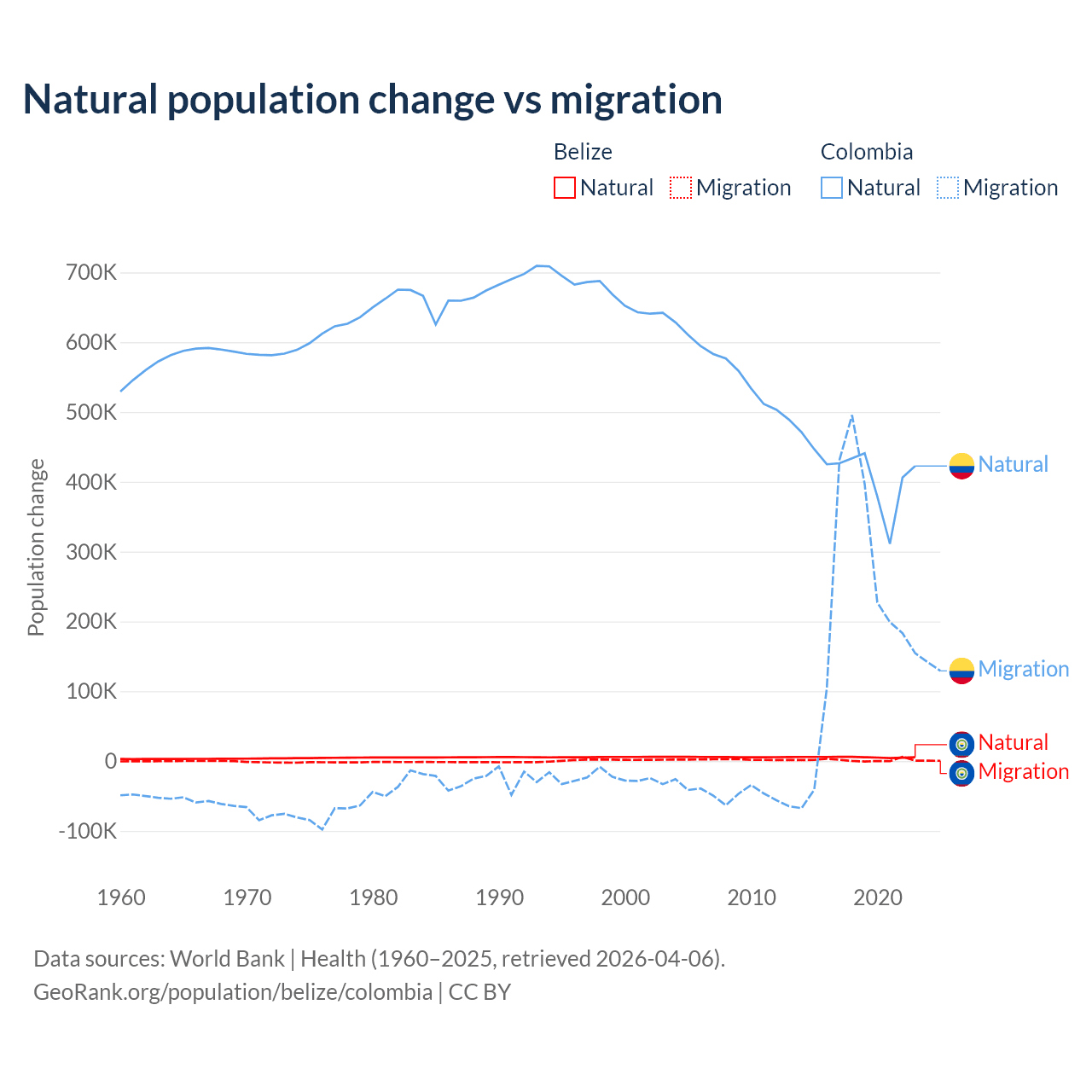 Over the last 10 years, 79.6% of the population change in Belize is from natural causes (a gain of 54,754 people) and 20.4% is from migration (a gain of 14,073 people). In Colombia 66.6% is from natural causes (a gain of 4,162,856 people) and 33.4% is from migration (a gain of 2,083,051 people).
