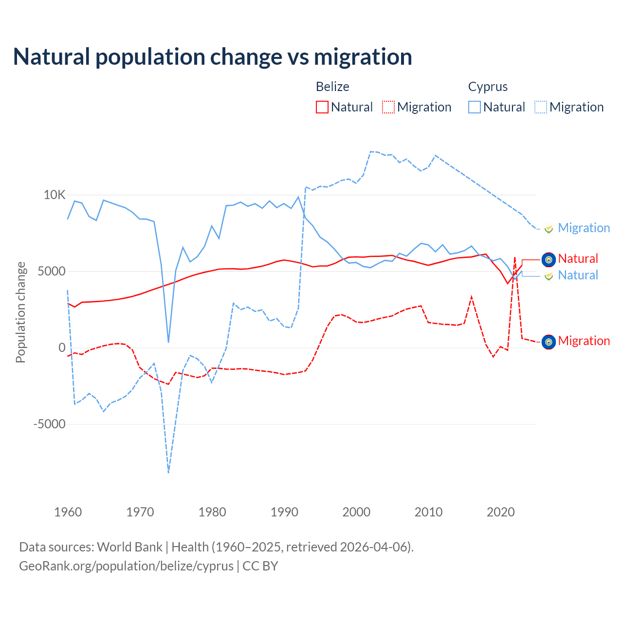 Over the last 10 years, 79.6% of the population change in Belize is from natural causes (a gain of 54,754 people) and 20.4% is from migration (a gain of 14,073 people). In Cyprus 36.2% is from natural causes (a gain of 57,464 people) and 63.8% is from migration (a gain of 101,458 people).