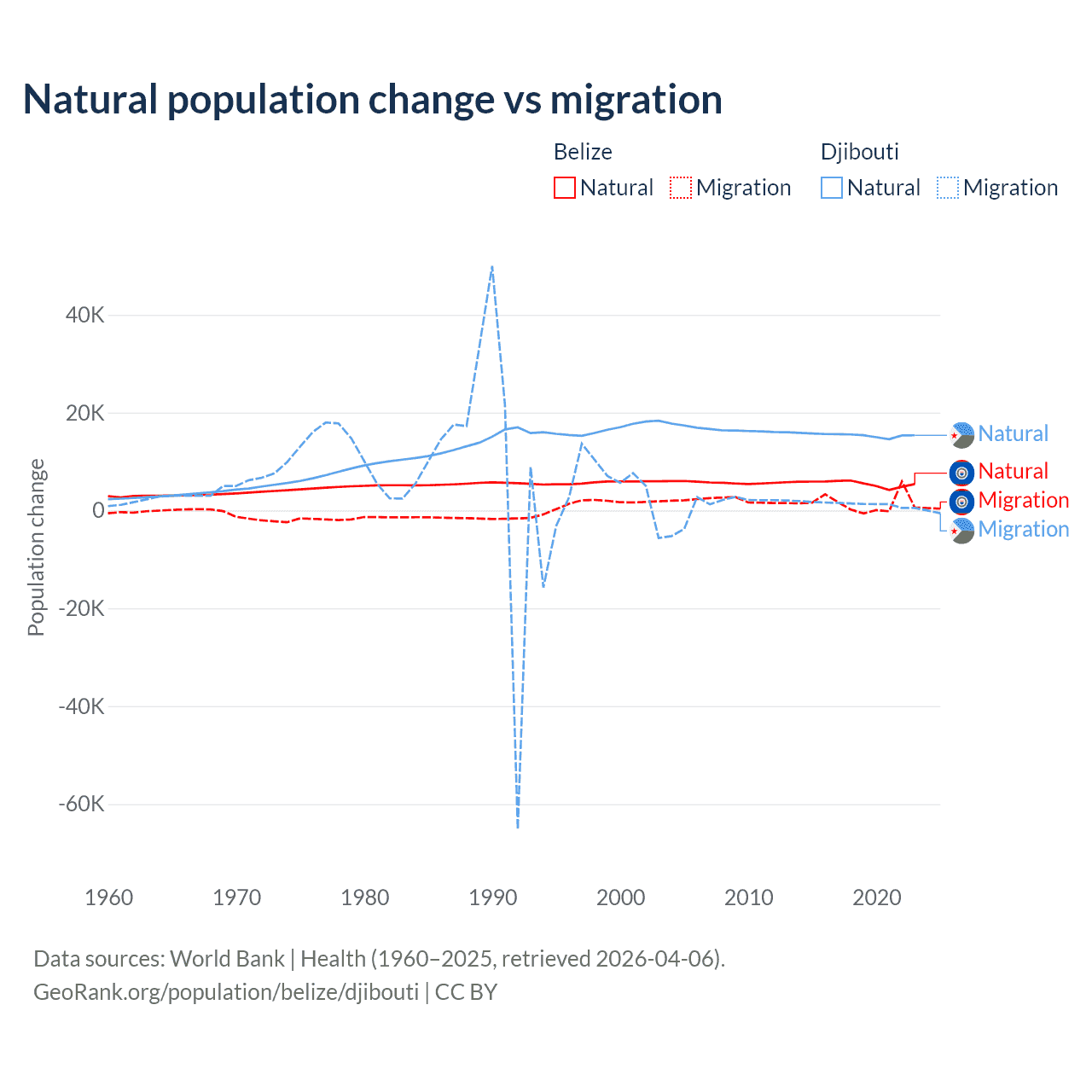 Over the last 10 years, 79.6% of the population change in Belize is from natural causes (a gain of 54,754 people) and 20.4% is from migration (a gain of 14,073 people). In Djibouti 92.1% is from natural causes (a gain of 153,892 people) and 7.87% is from migration (a gain of 13,138 people).