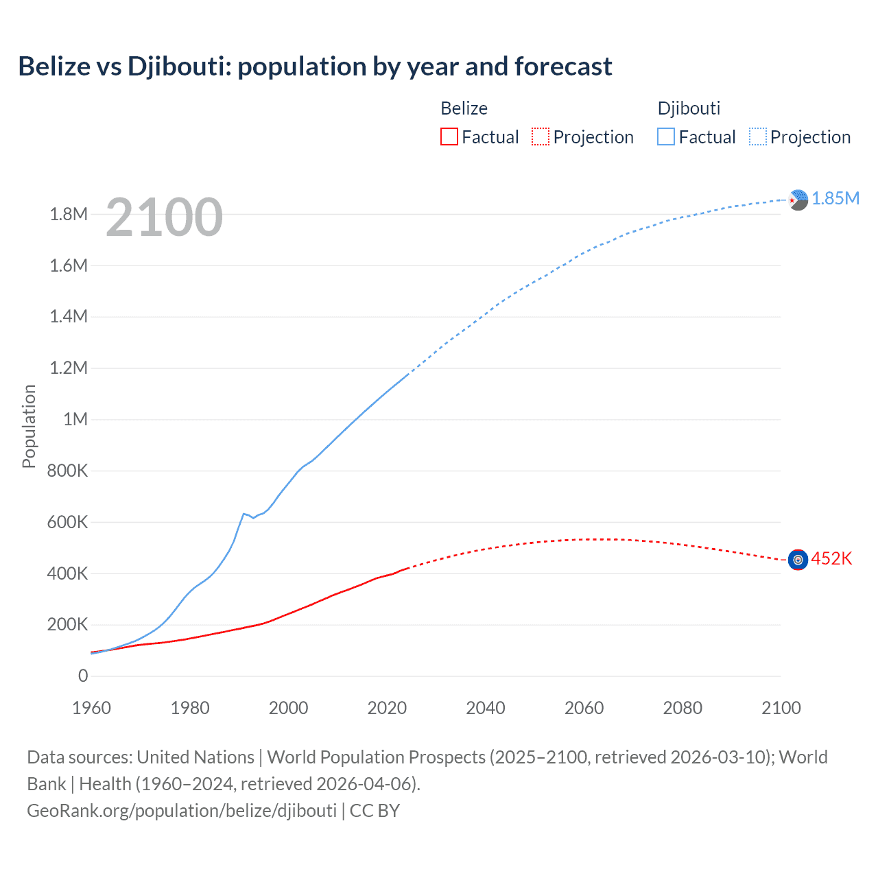 Belize vs Djibouti: population by year and forecast