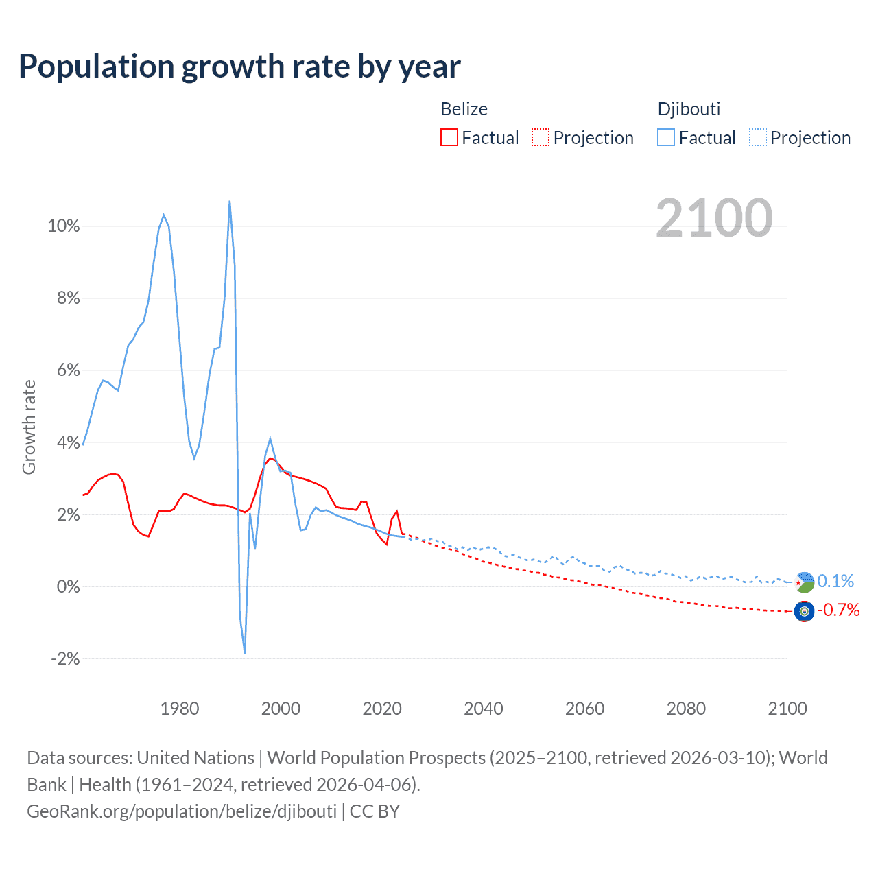 - For the last 10 years, Belize has had an average growth rate of +1.83% per year vs +1.57% in Djibouti.