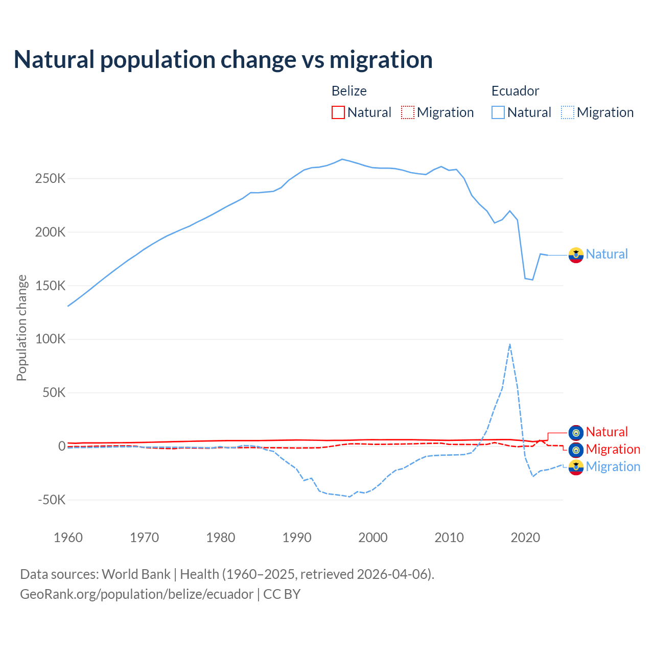 Over the last 10 years, 79.6% of the population change in Belize is from natural causes (a gain of 54,754 people) and 20.4% is from migration (a gain of 14,073 people). In Ecuador 91.9% is from natural causes (a gain of 1,964,352 people) and 8.08% is from migration (a gain of 172,707 people).