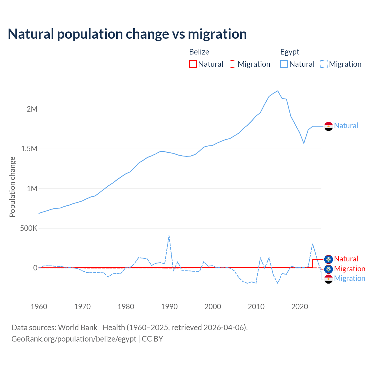 Over the last 10 years, 79.6% of the population change in Belize is from natural causes (a gain of 54,754 people) and 20.4% is from migration (a gain of 14,073 people). In Egypt 99.6% is from natural causes (a gain of 19,180,073 people) and 0.41% is from migration (a loss of 78,975 people).