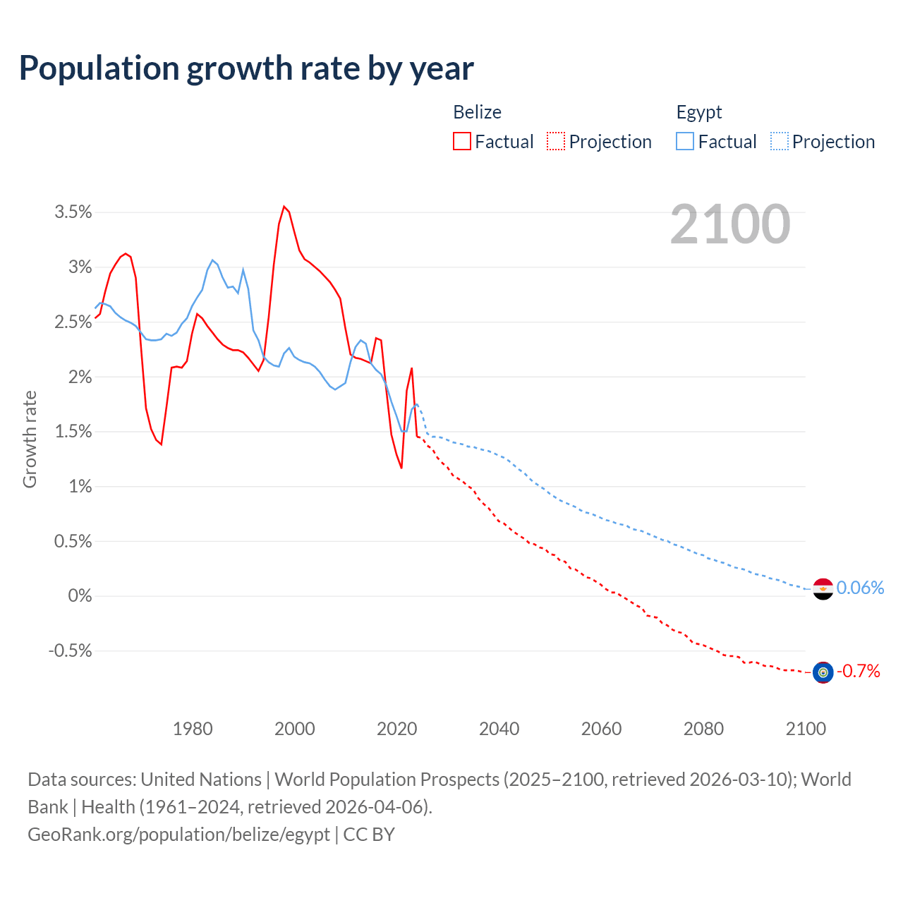 - For the last 10 years, Belize has had an average growth rate of +1.83% per year vs +1.84% in Egypt.