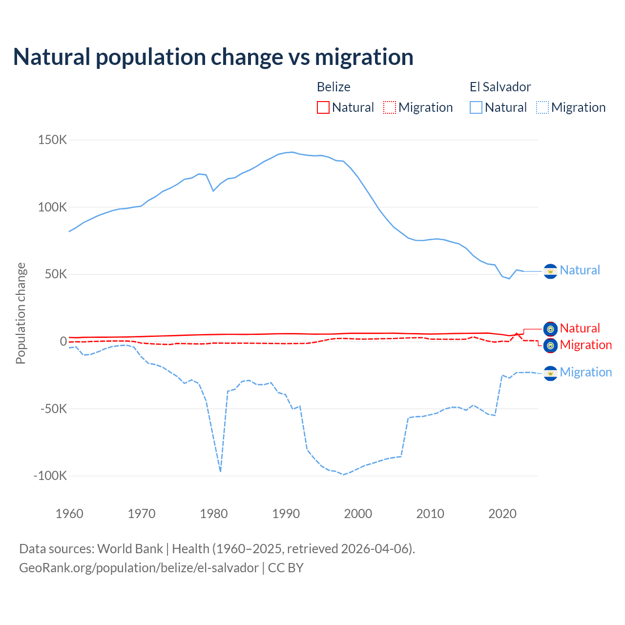 Over the last 10 years, 79.6% of the population change in Belize is from natural causes (a gain of 54,754 people) and 20.4% is from migration (a gain of 14,073 people). In El Salvador 58.8% is from natural causes (a gain of 579,641 people) and 41.2% is from migration (a loss of 406,874 people).