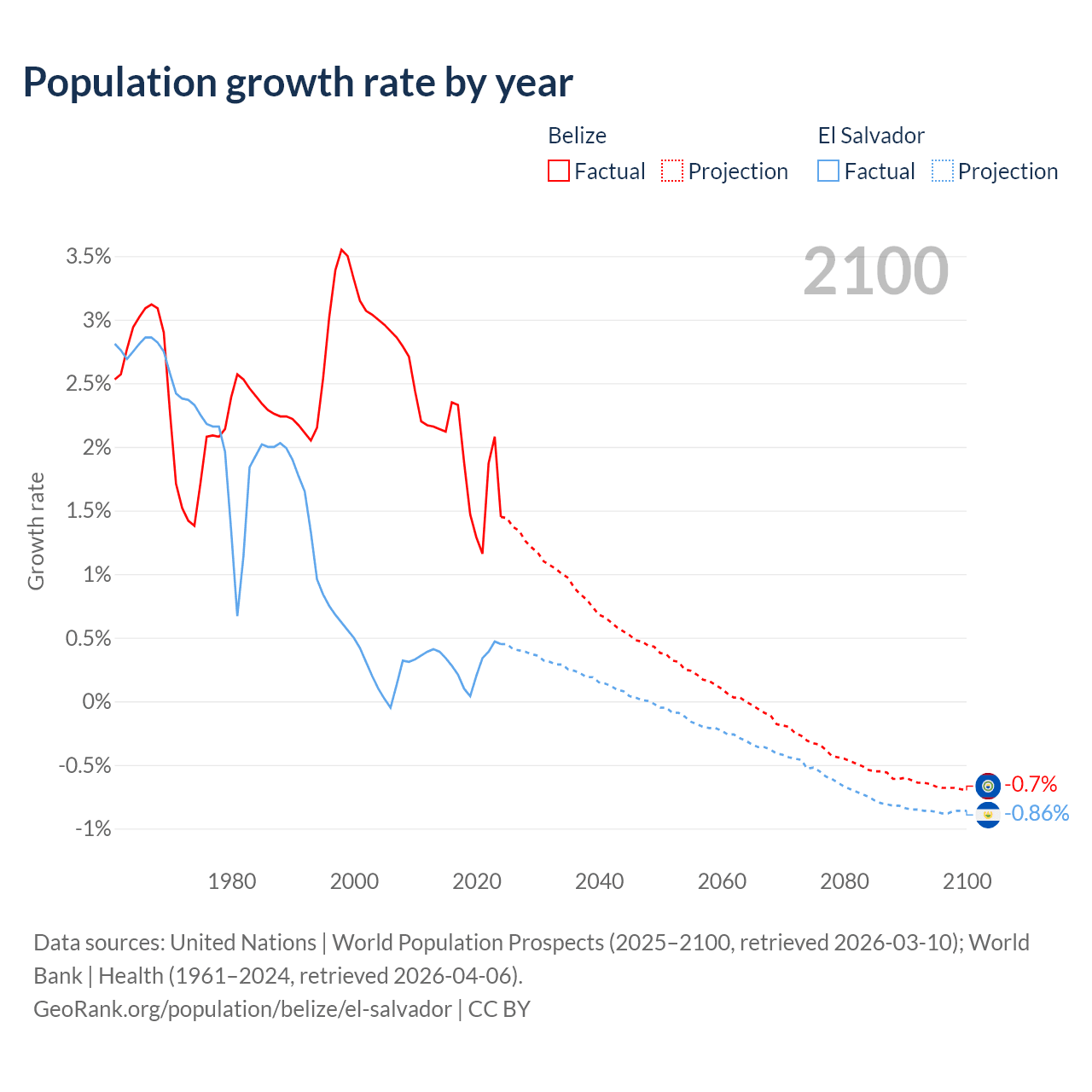 - For the last 10 years, Belize has had an average growth rate of +1.83% per year vs +0.29% in El Salvador.