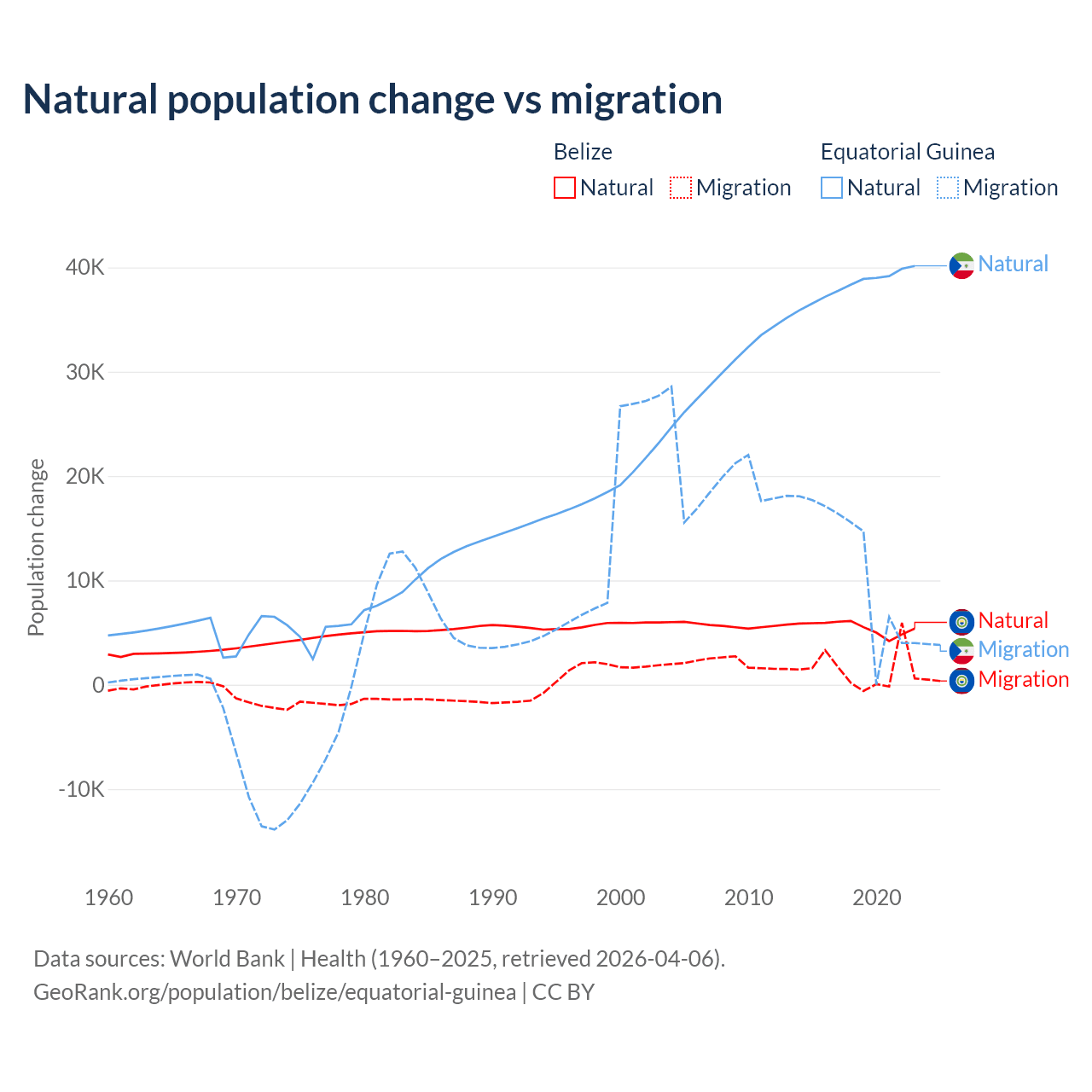 Over the last 10 years, 79.6% of the population change in Belize is from natural causes (a gain of 54,754 people) and 20.4% is from migration (a gain of 14,073 people). In Equatorial Guinea 77% is from natural causes (a gain of 382,745 people) and 23% is from migration (a gain of 114,024 people).