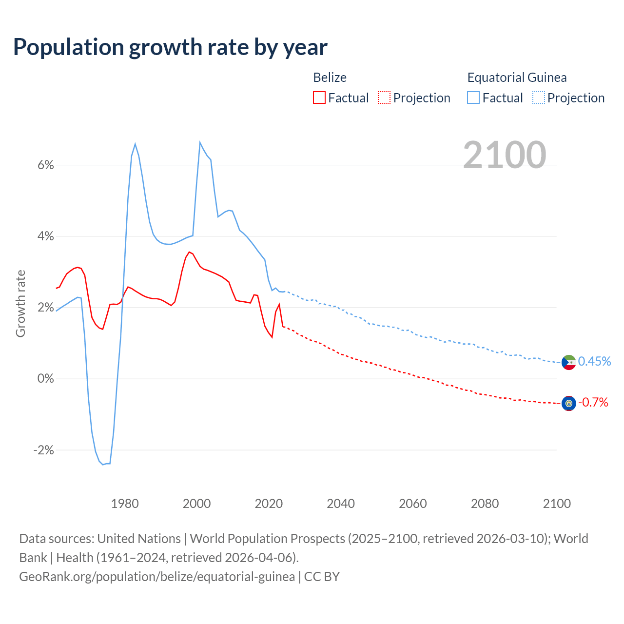 - For the last 10 years, Belize has had an average growth rate of +1.83% per year vs +3.15% in Equatorial Guinea.