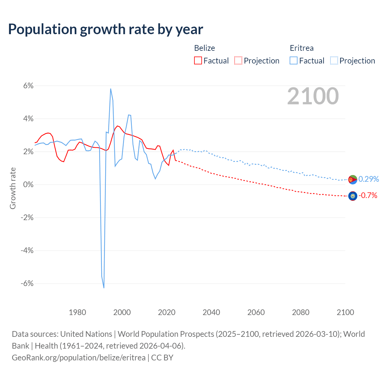 - For the last 10 years, Belize has had an average growth rate of +1.83% per year vs +1.28% in Eritrea.