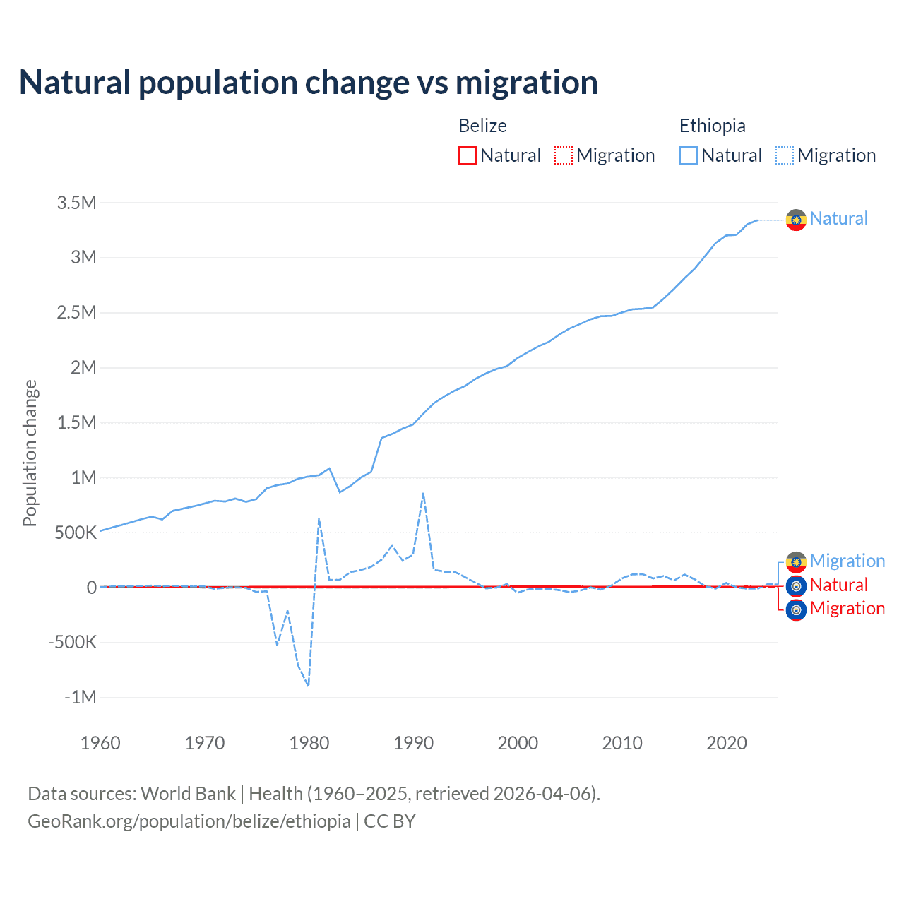 Over the last 10 years, 79.6% of the population change in Belize is from natural causes (a gain of 54,754 people) and 20.4% is from migration (a gain of 14,073 people). In Ethiopia 98.8% is from natural causes (a gain of 30,237,373 people) and 1.19% is from migration (a gain of 365,488 people).