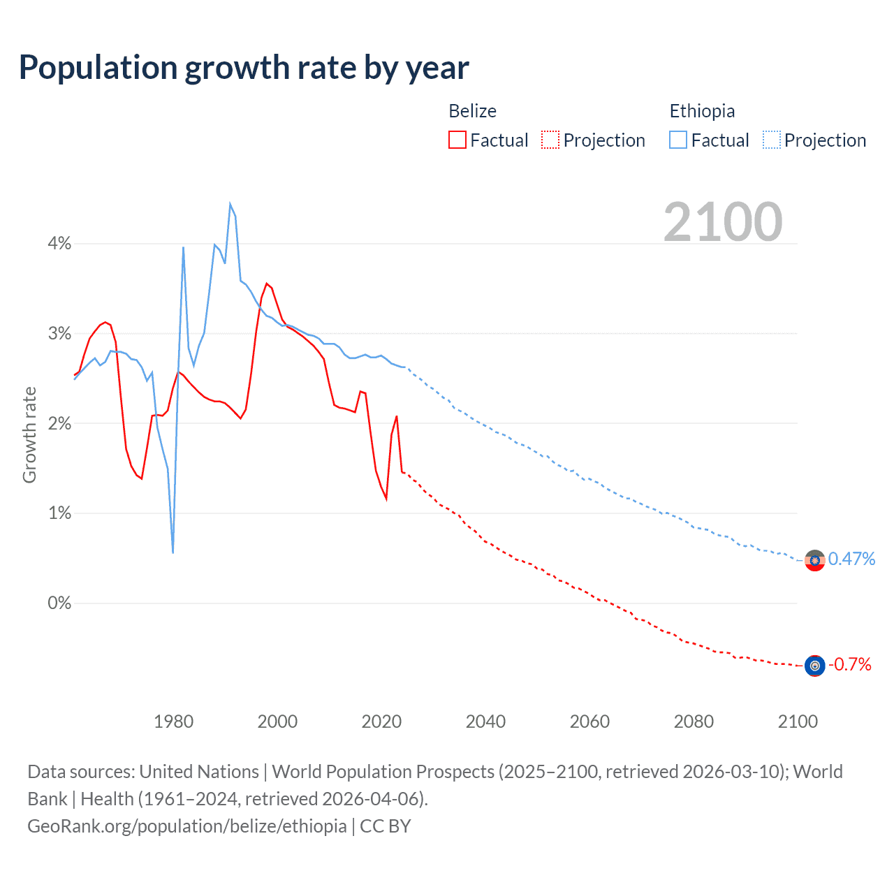 - For the last 10 years, Belize has had an average growth rate of +1.83% per year vs +2.71% in Ethiopia.