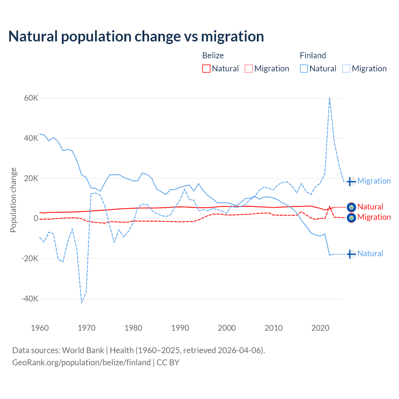 Over the last 10 years, 79.6% of the population change in Belize is from natural causes (a gain of 54,754 people) and 20.4% is from migration (a gain of 14,073 people). In Finland 22.5% is from natural causes (a loss of 65,560 people) and 77.5% is from migration (a gain of 225,237 people).