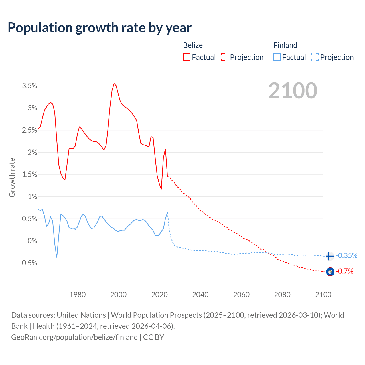 - For the last 10 years, Belize has had an average growth rate of +1.83% per year vs +0.3% in Finland.