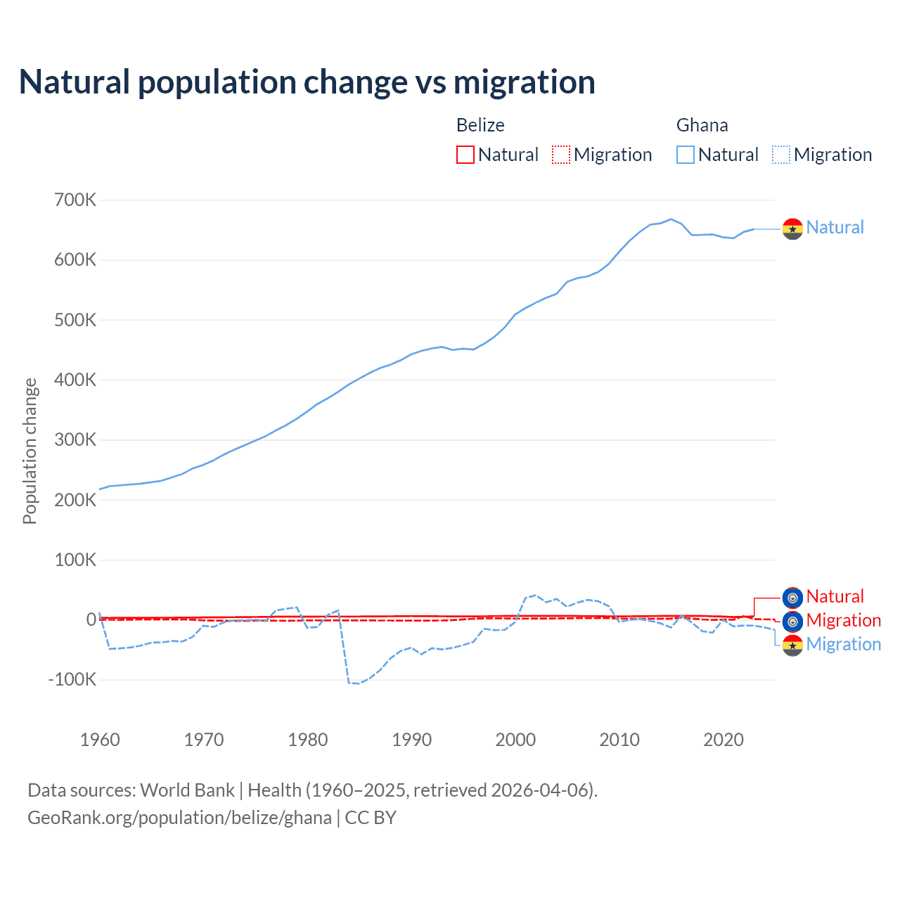 Over the last 10 years, 79.6% of the population change in Belize is from natural causes (a gain of 54,754 people) and 20.4% is from migration (a gain of 14,073 people). In Ghana 98.6% is from natural causes (a gain of 6,484,449 people) and 1.37% is from migration (a loss of 90,310 people).
