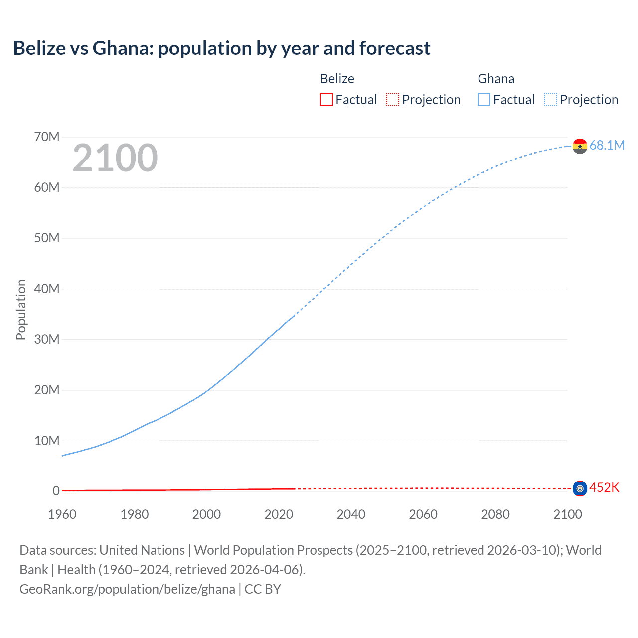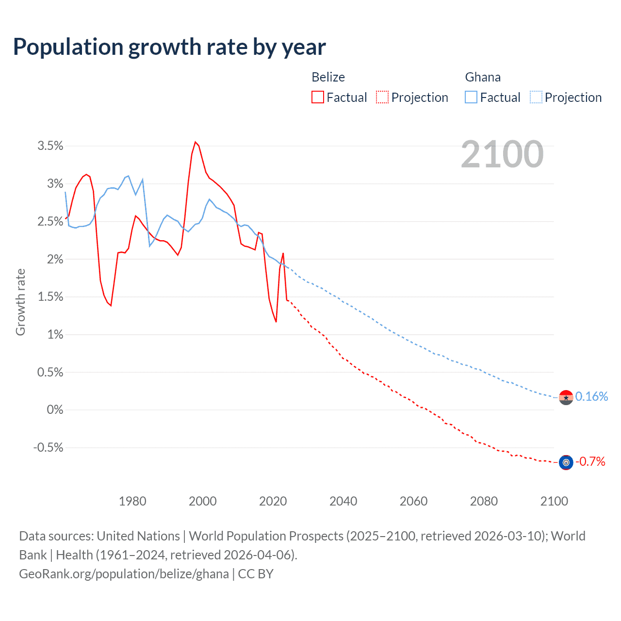 - For the last 10 years, Belize has had an average growth rate of +1.83% per year vs +2.1% in Ghana.