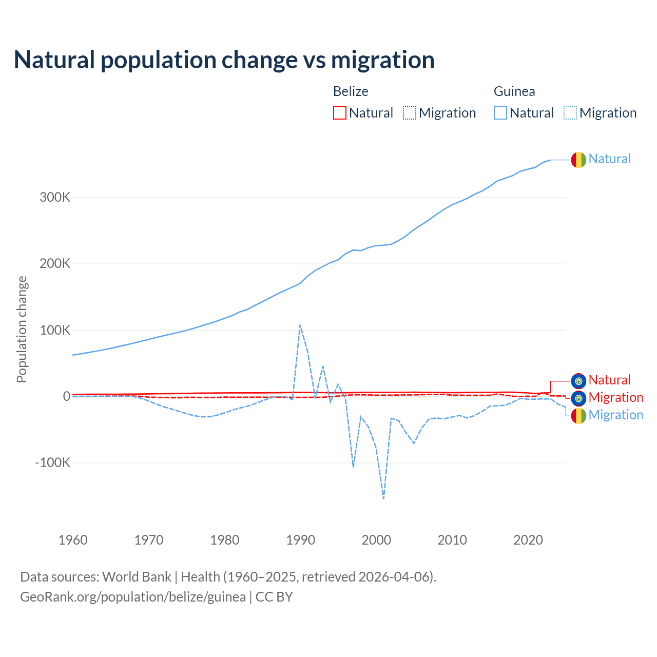 Over the last 10 years, 79.6% of the population change in Belize is from natural causes (a gain of 54,754 people) and 20.4% is from migration (a gain of 14,073 people). In Guinea 97.2% is from natural causes (a gain of 3,346,936 people) and 2.76% is from migration (a loss of 94,924 people).
