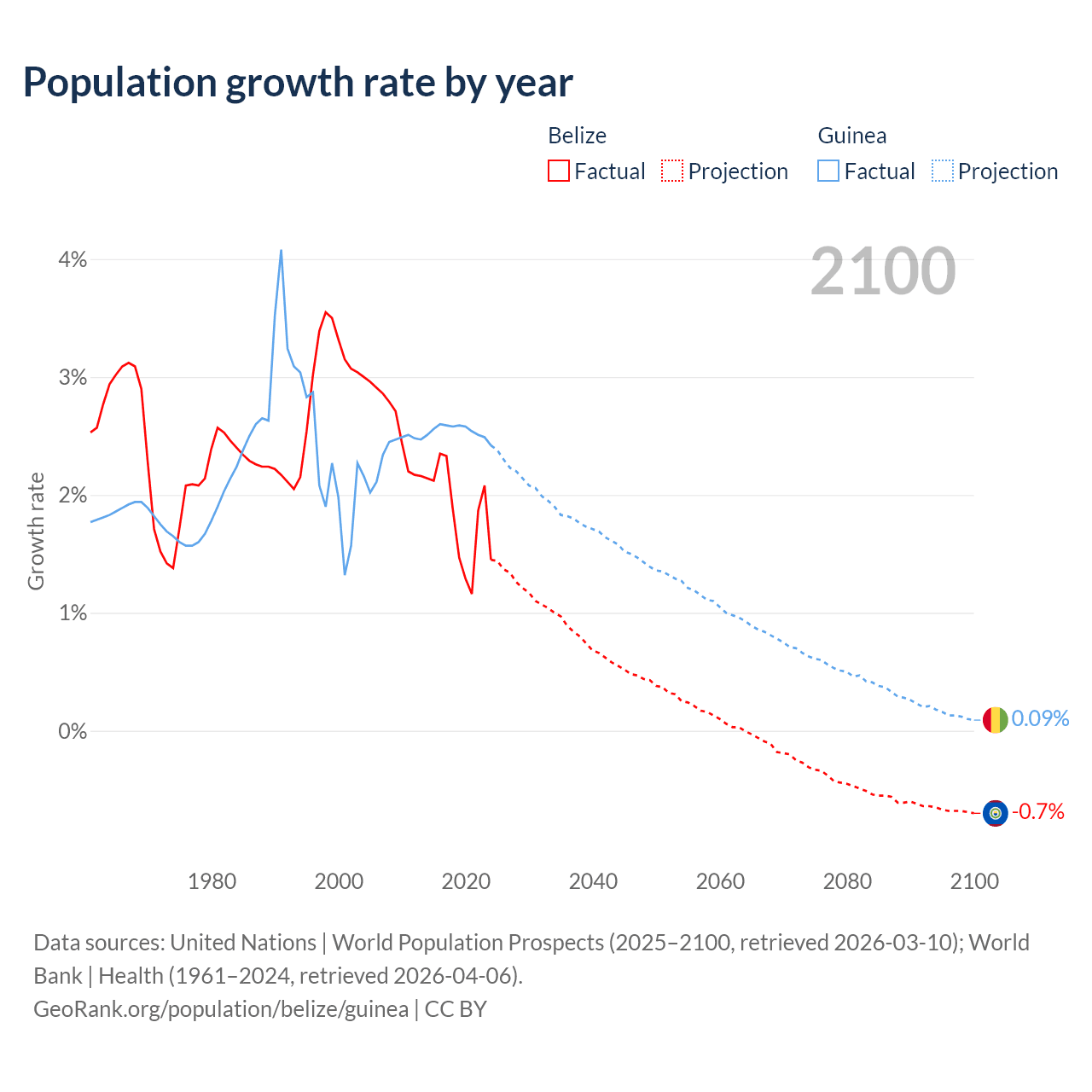 - For the last 10 years, Belize has had an average growth rate of +1.83% per year vs +2.54% in Guinea.