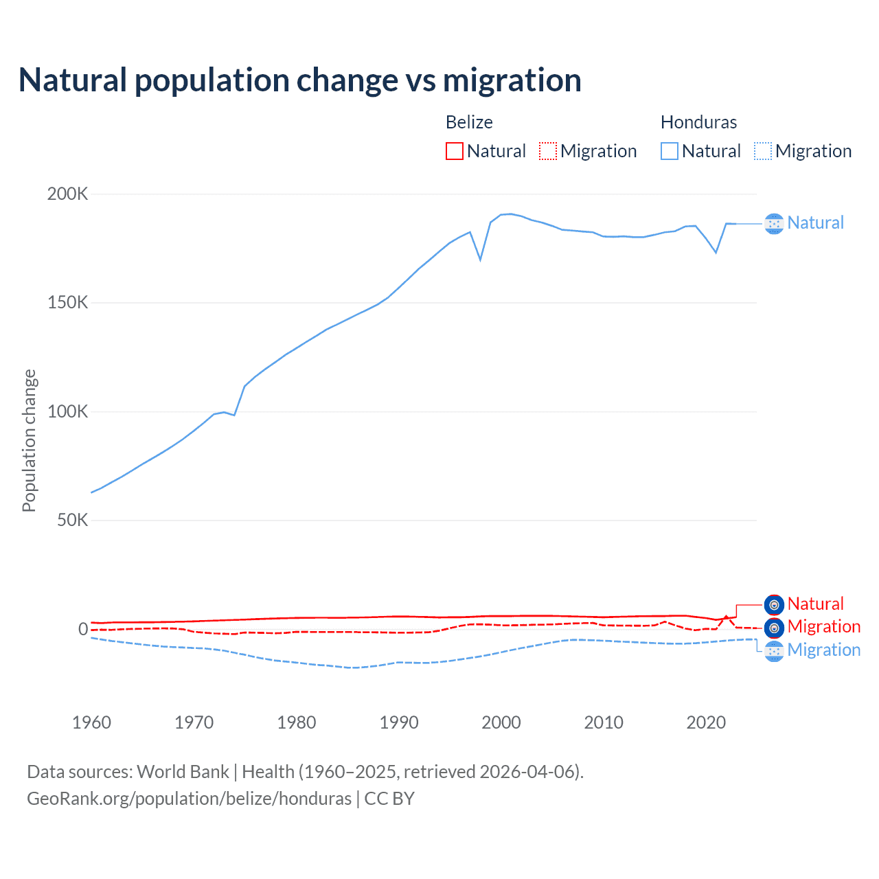 Over the last 10 years, 79.6% of the population change in Belize is from natural causes (a gain of 54,754 people) and 20.4% is from migration (a gain of 14,073 people). In Honduras 96.7% is from natural causes (a gain of 1,821,125 people) and 3.29% is from migration (a loss of 61,965 people).