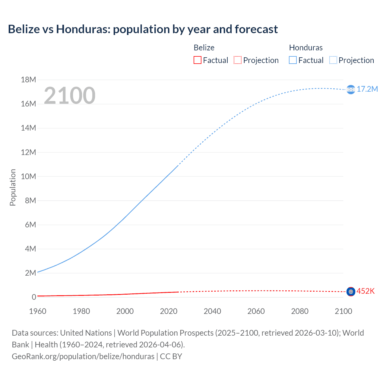 The latest officially reported population of Belize was 417,072 in 2024 vs 10,825,703 people in Honduras in 2024. In 2026, based on the adjusted UN estimation, the current Belize's population is 430,409 people compared to 11,237,619 in Honduras.