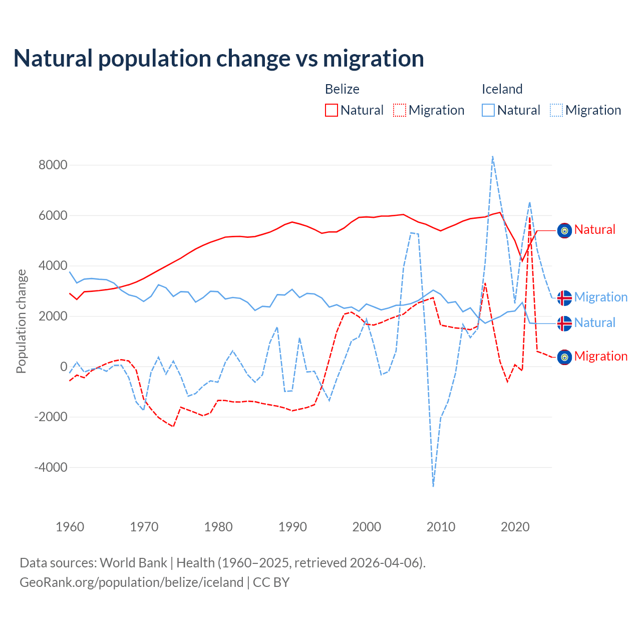 Over the last 10 years, 79.6% of the population change in Belize is from natural causes (a gain of 54,754 people) and 20.4% is from migration (a gain of 14,073 people). In Iceland 30.7% is from natural causes (a gain of 20,128 people) and 69.3% is from migration (a gain of 45,356 people).