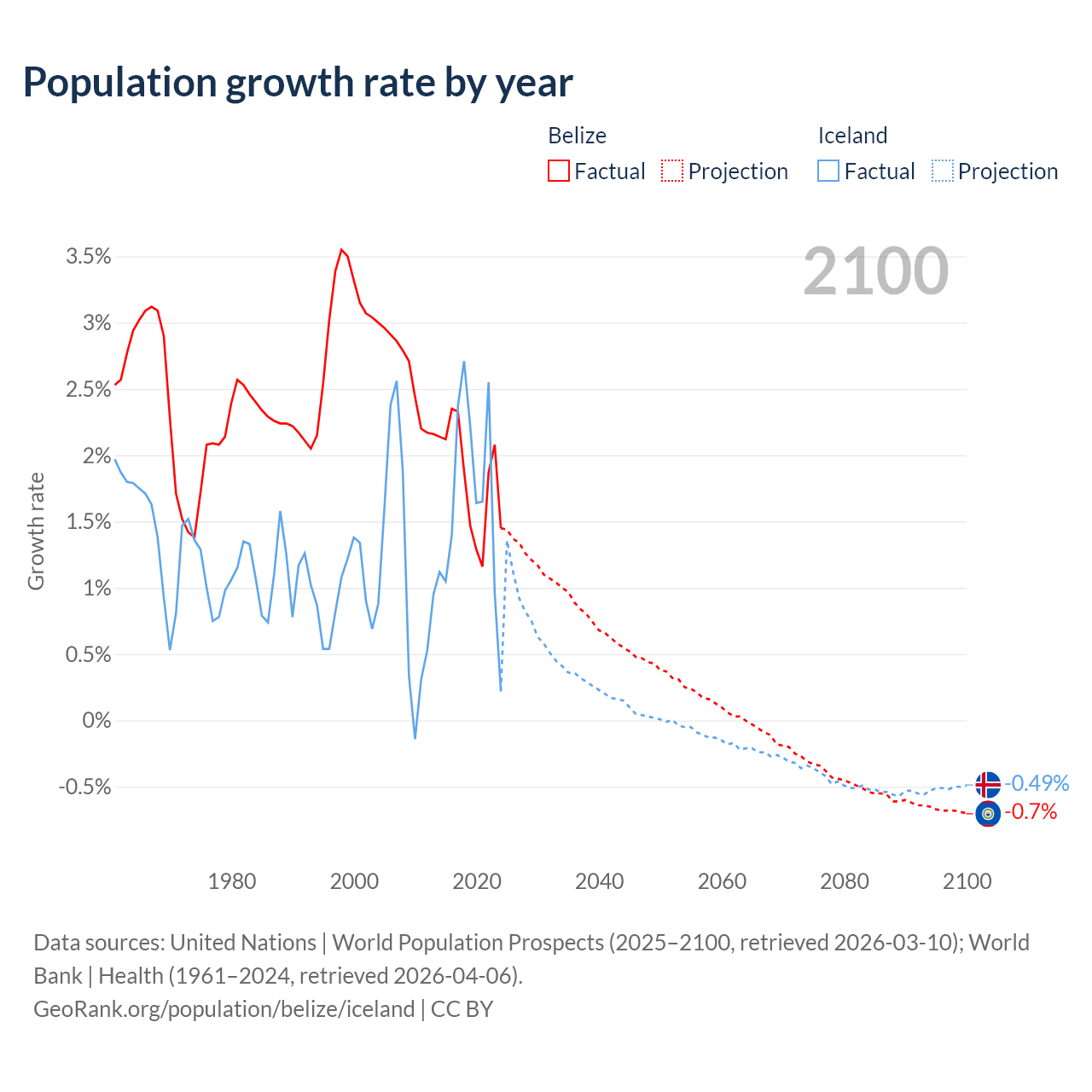 - For the last 10 years, Belize has had an average growth rate of +1.83% per year vs +1.63% in Iceland.