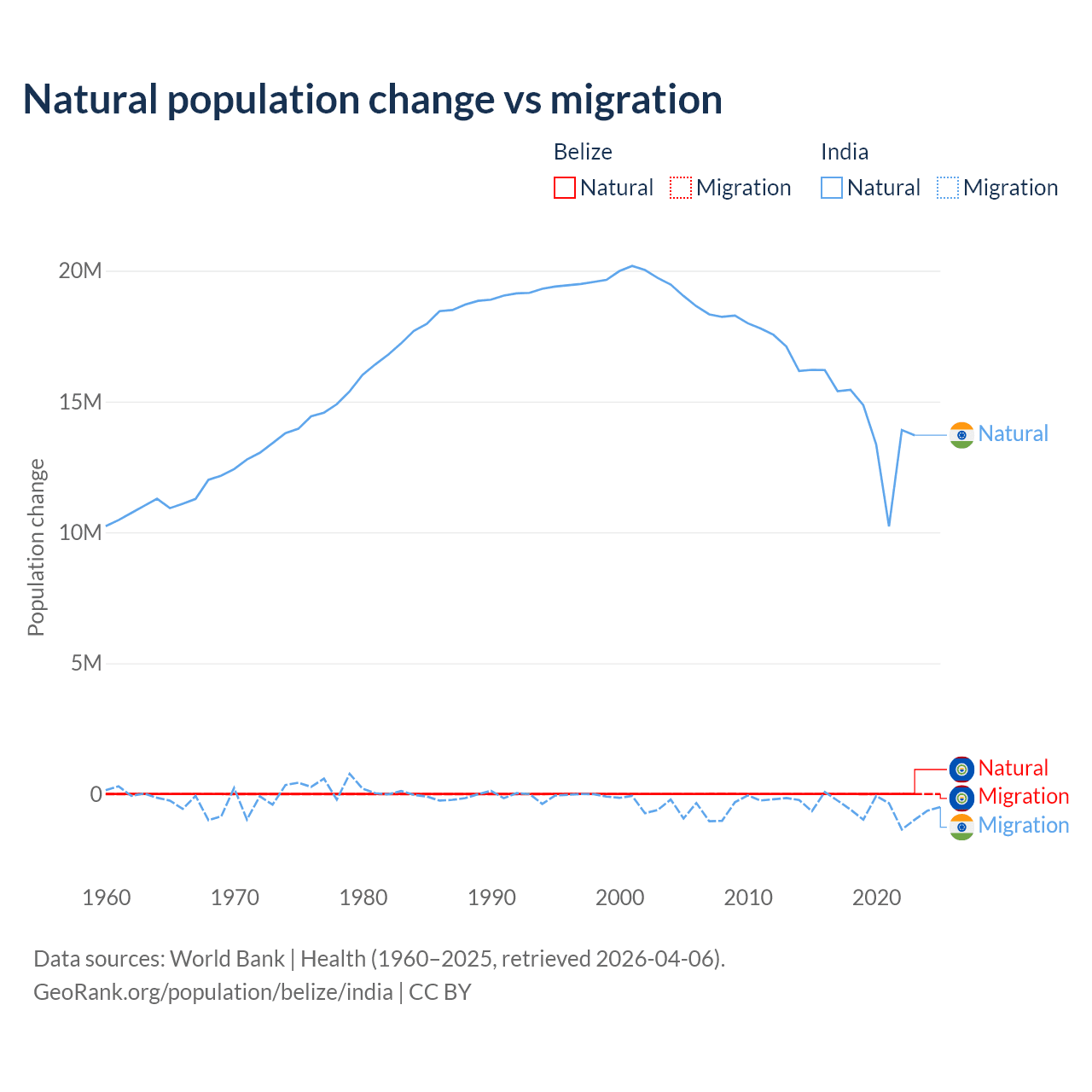 Over the last 10 years, 79.6% of the population change in Belize is from natural causes (a gain of 54,754 people) and 20.4% is from migration (a gain of 14,073 people). In India 96.4% is from natural causes (a gain of 145,503,378 people) and 3.56% is from migration (a loss of 5,376,884 people).