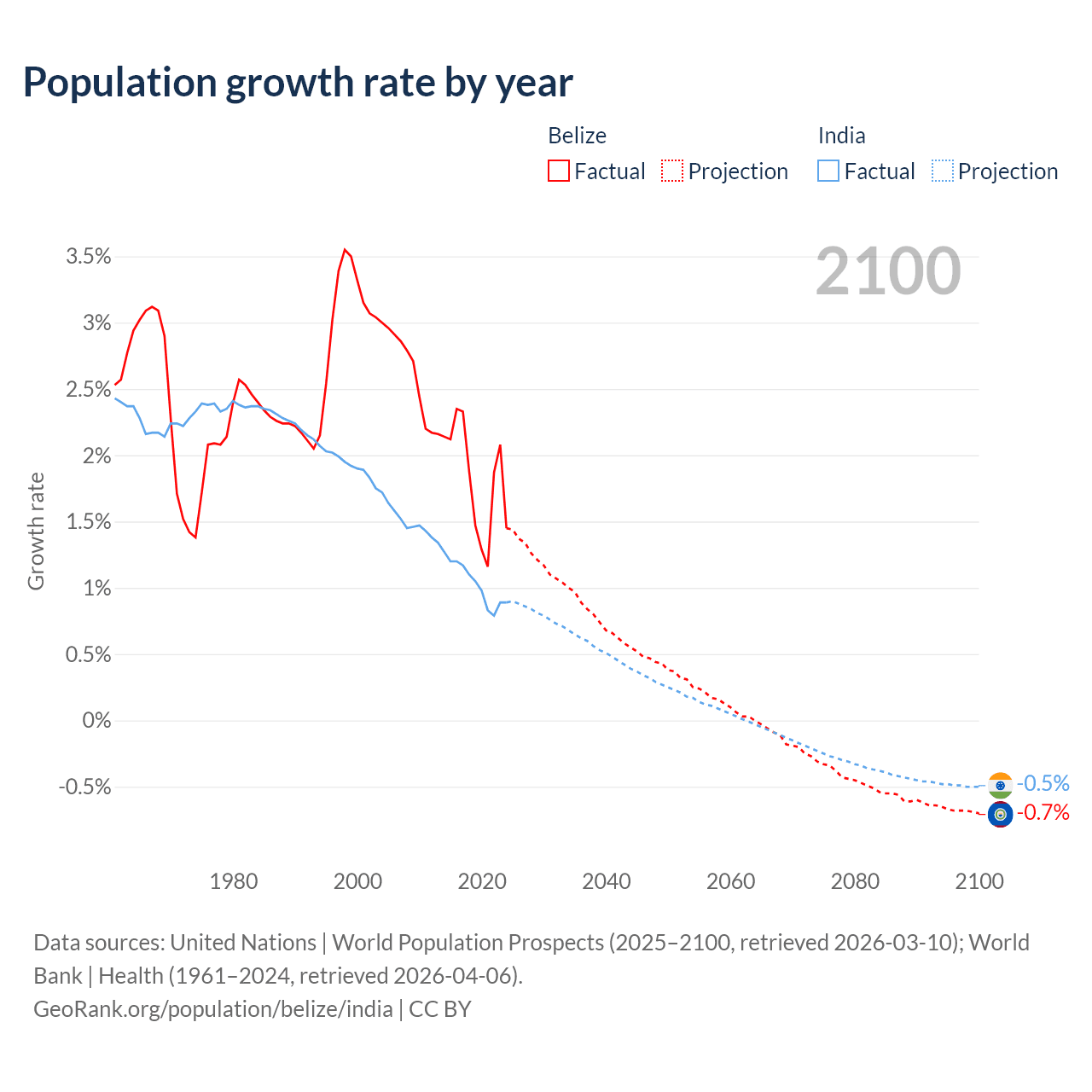 - For the last 10 years, Belize has had an average growth rate of +1.83% per year vs +1.03% in India.