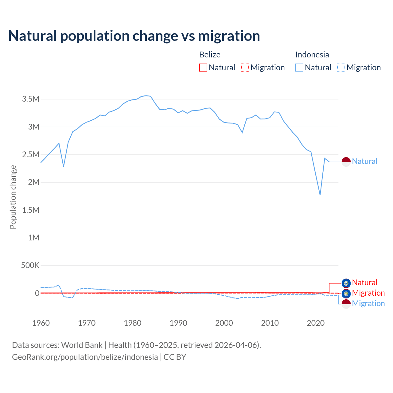 Over the last 10 years, 79.6% of the population change in Belize is from natural causes (a gain of 54,754 people) and 20.4% is from migration (a gain of 14,073 people). In Indonesia 98.9% is from natural causes (a gain of 25,242,860 people) and 1.1% is from migration (a loss of 280,258 people).