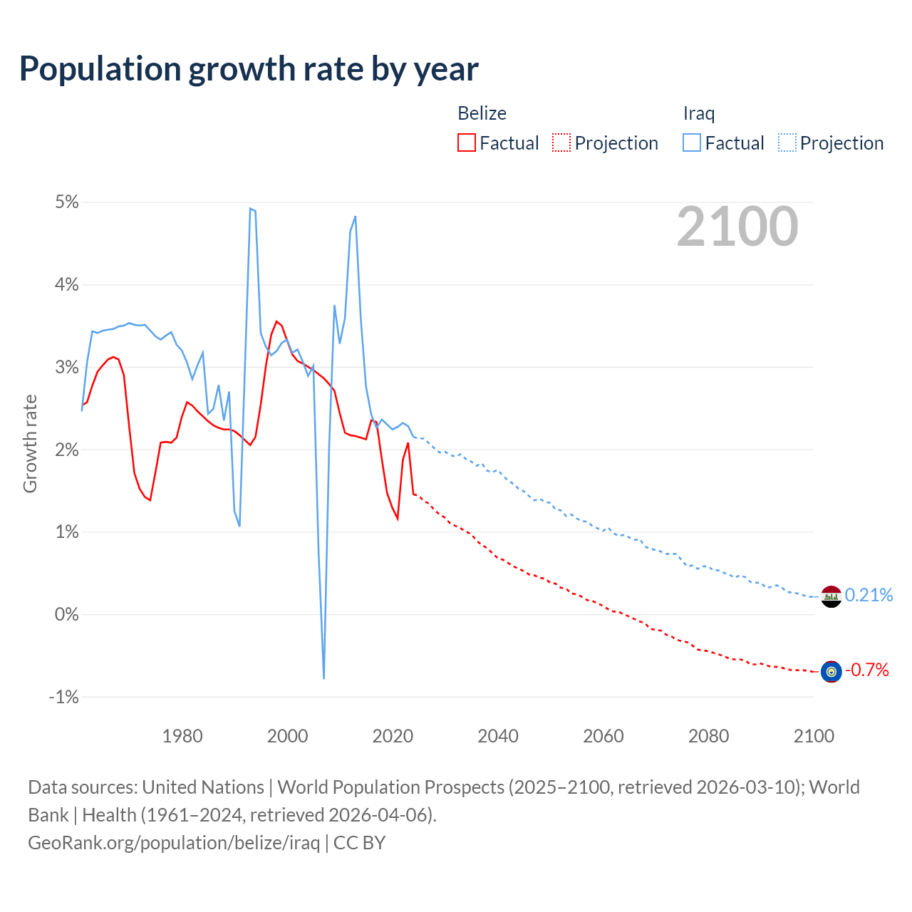 - For the last 10 years, Belize has had an average growth rate of +1.83% per year vs +2.45% in Iraq.