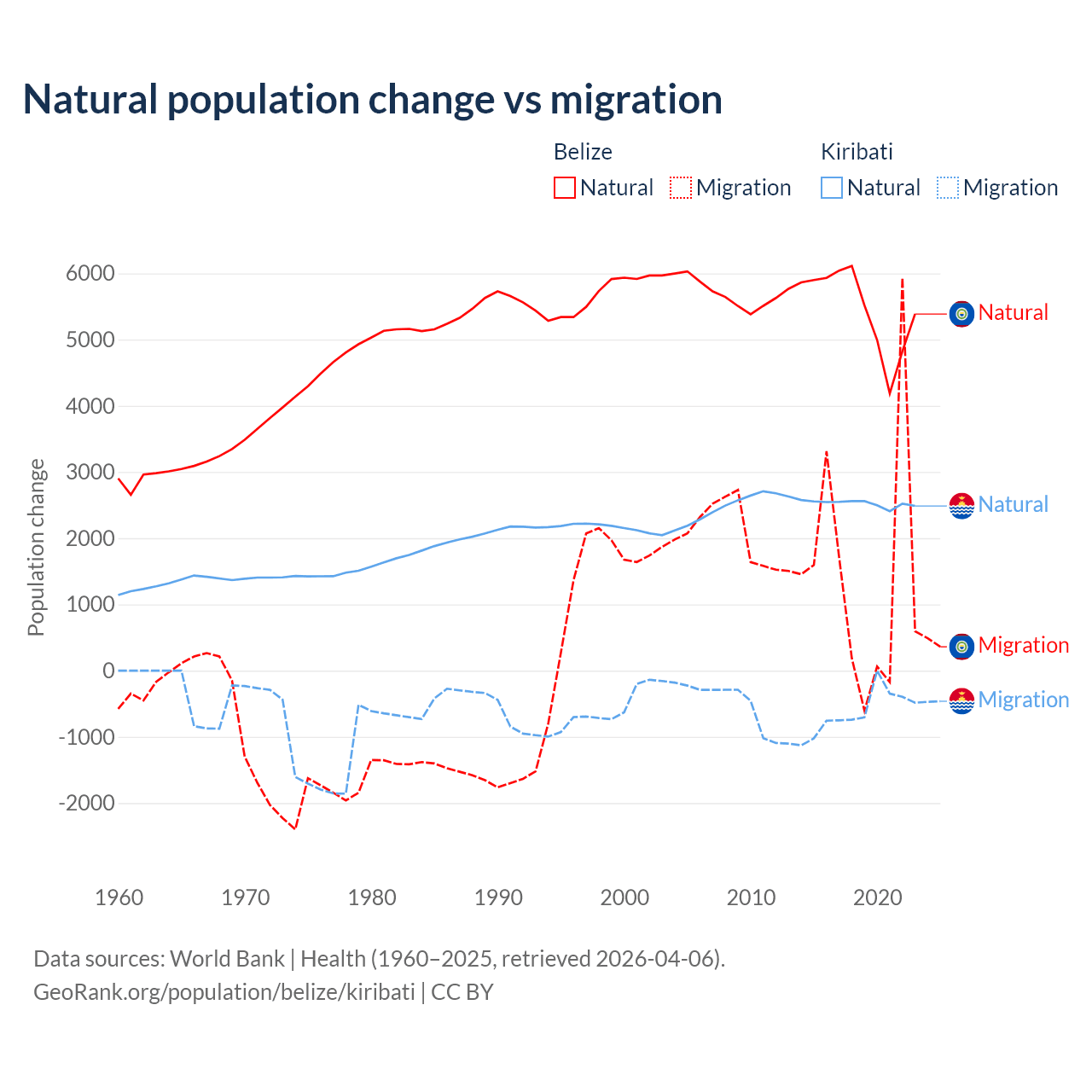 Over the last 10 years, 79.6% of the population change in Belize is from natural causes (a gain of 54,754 people) and 20.4% is from migration (a gain of 14,073 people). In Kiribati 80% is from natural causes (a gain of 25,262 people) and 20% is from migration (a loss of 6,330 people).
