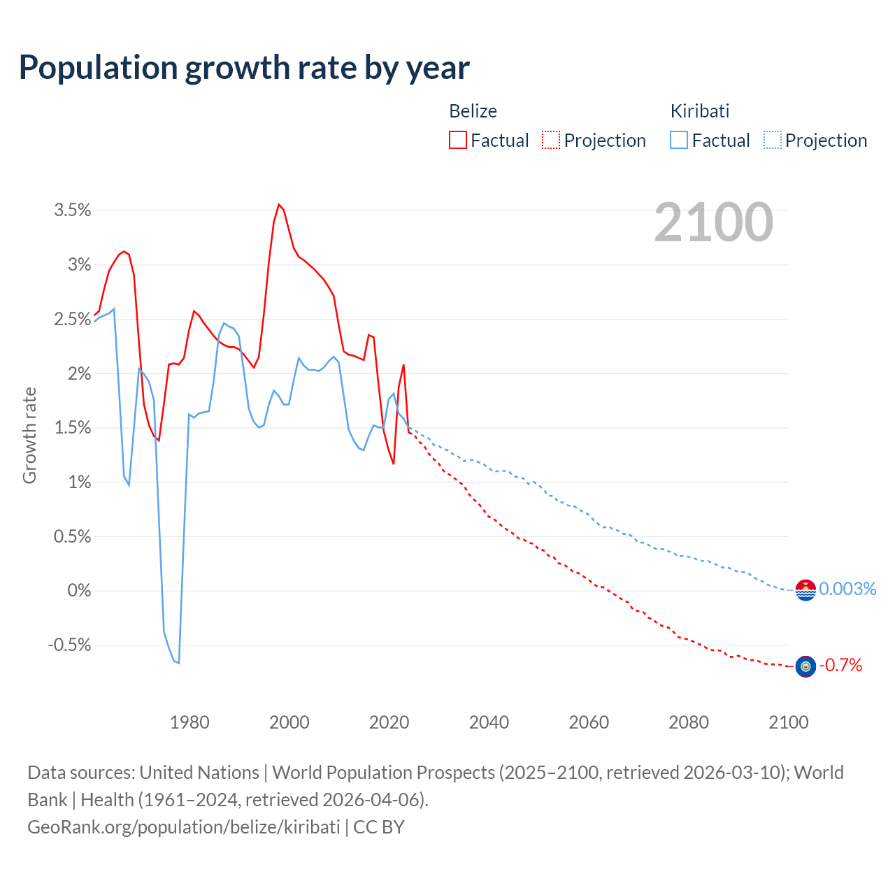 - For the last 10 years, Belize has had an average growth rate of +1.83% per year vs +1.53% in Kiribati.