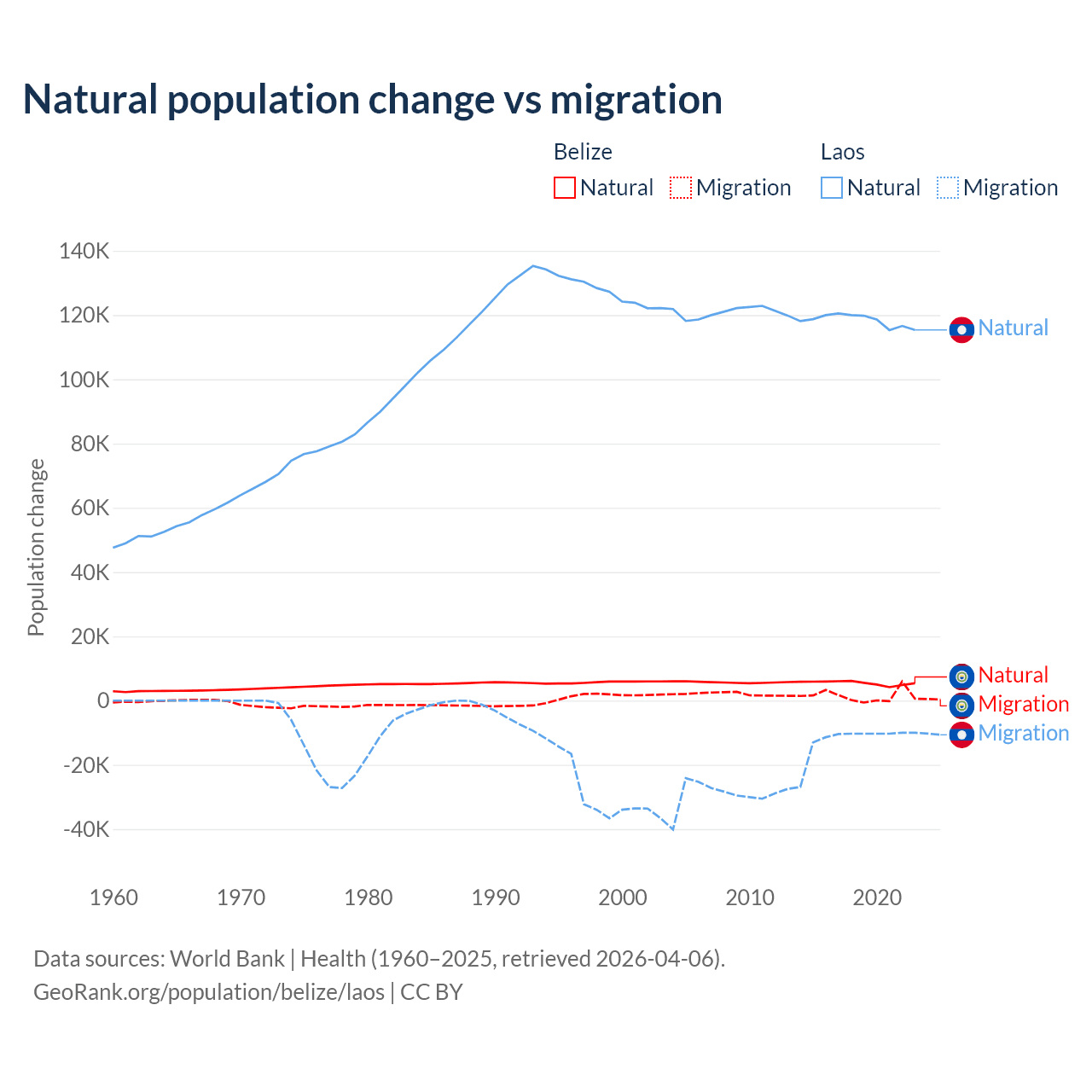 Over the last 10 years, 79.6% of the population change in Belize is from natural causes (a gain of 54,754 people) and 20.4% is from migration (a gain of 14,073 people). In Laos 90.6% is from natural causes (a gain of 1,183,013 people) and 9.41% is from migration (a loss of 122,899 people).