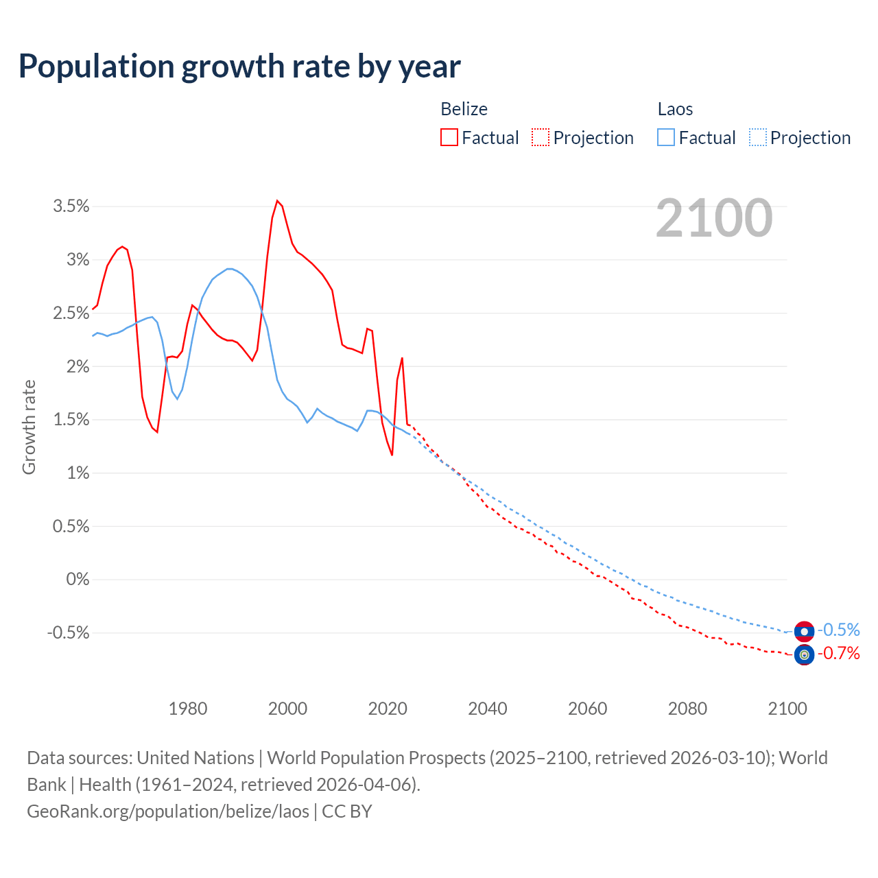 - For the last 10 years, Belize has had an average growth rate of +1.83% per year vs +1.48% in Laos.