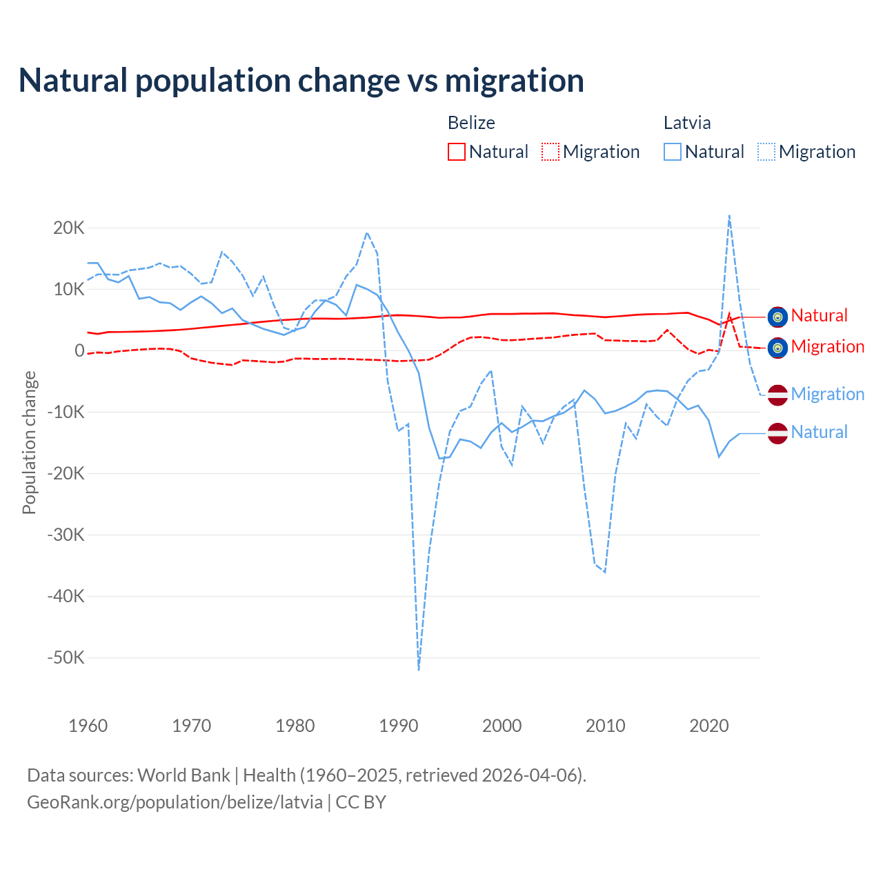 Over the last 10 years, 79.6% of the population change in Belize is from natural causes (a gain of 54,754 people) and 20.4% is from migration (a gain of 14,073 people). In Latvia 82.7% is from natural causes (a loss of 103,711 people) and 17.3% is from migration (a loss of 21,641 people).
