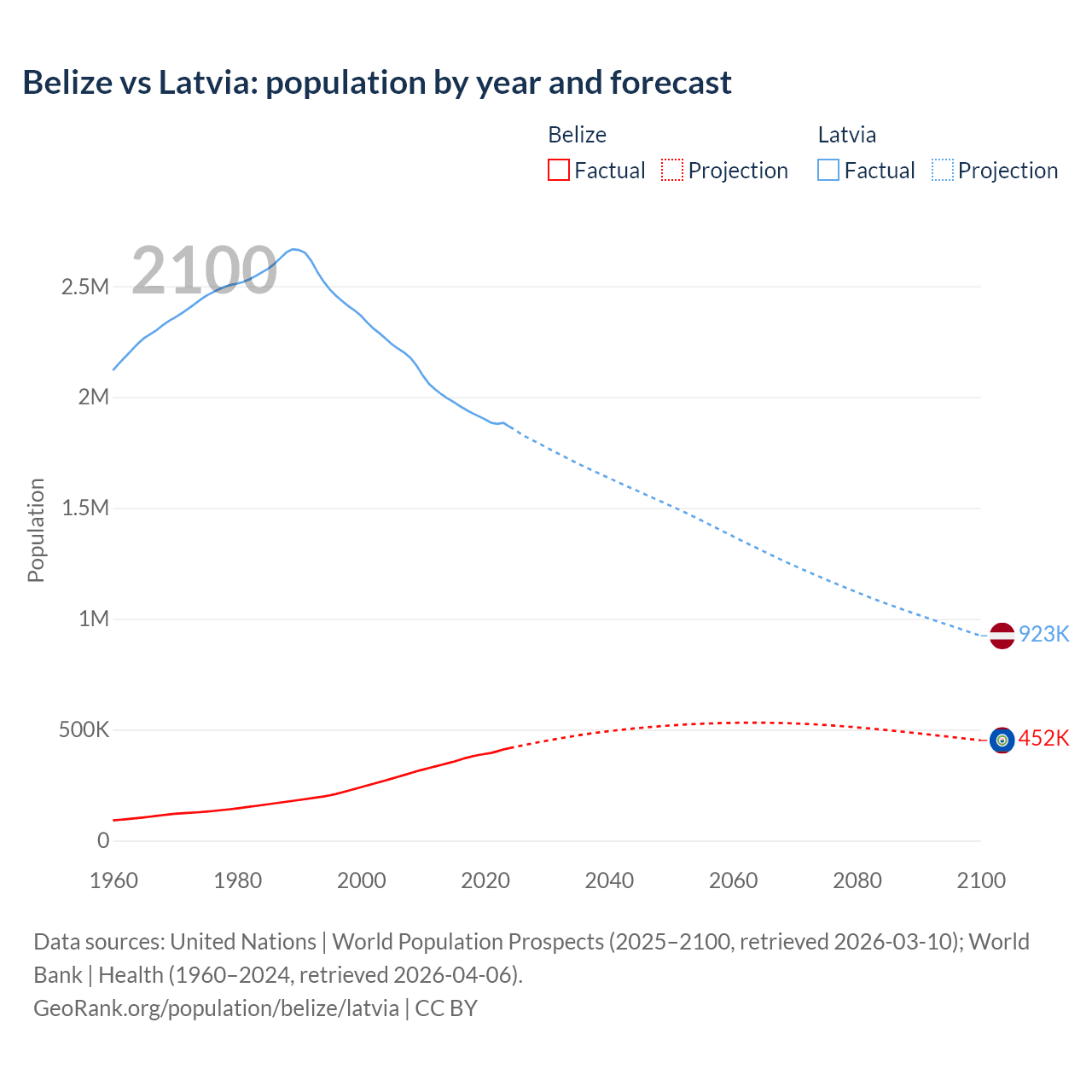 Belize vs Latvia: population by year and forecast
