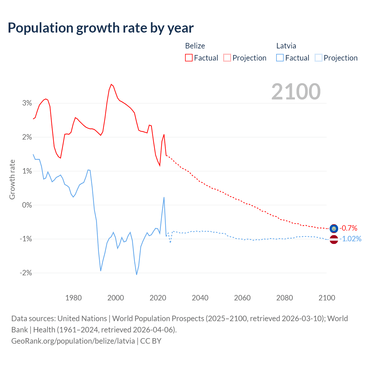 - For the last 10 years, Belize has had an average growth rate of +1.83% per year vs -0.68% in Latvia.