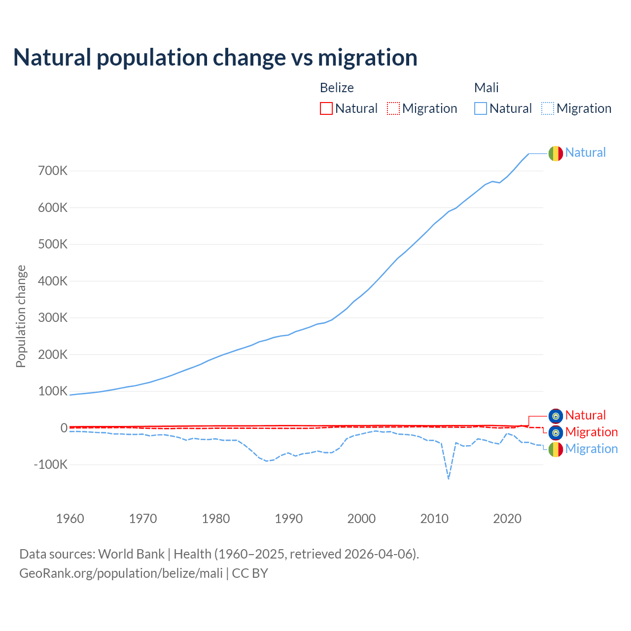 Over the last 10 years, 79.6% of the population change in Belize is from natural causes (a gain of 54,754 people) and 20.4% is from migration (a gain of 14,073 people). In Mali 94.9% is from natural causes (a gain of 6,749,473 people) and 5.13% is from migration (a loss of 365,292 people).