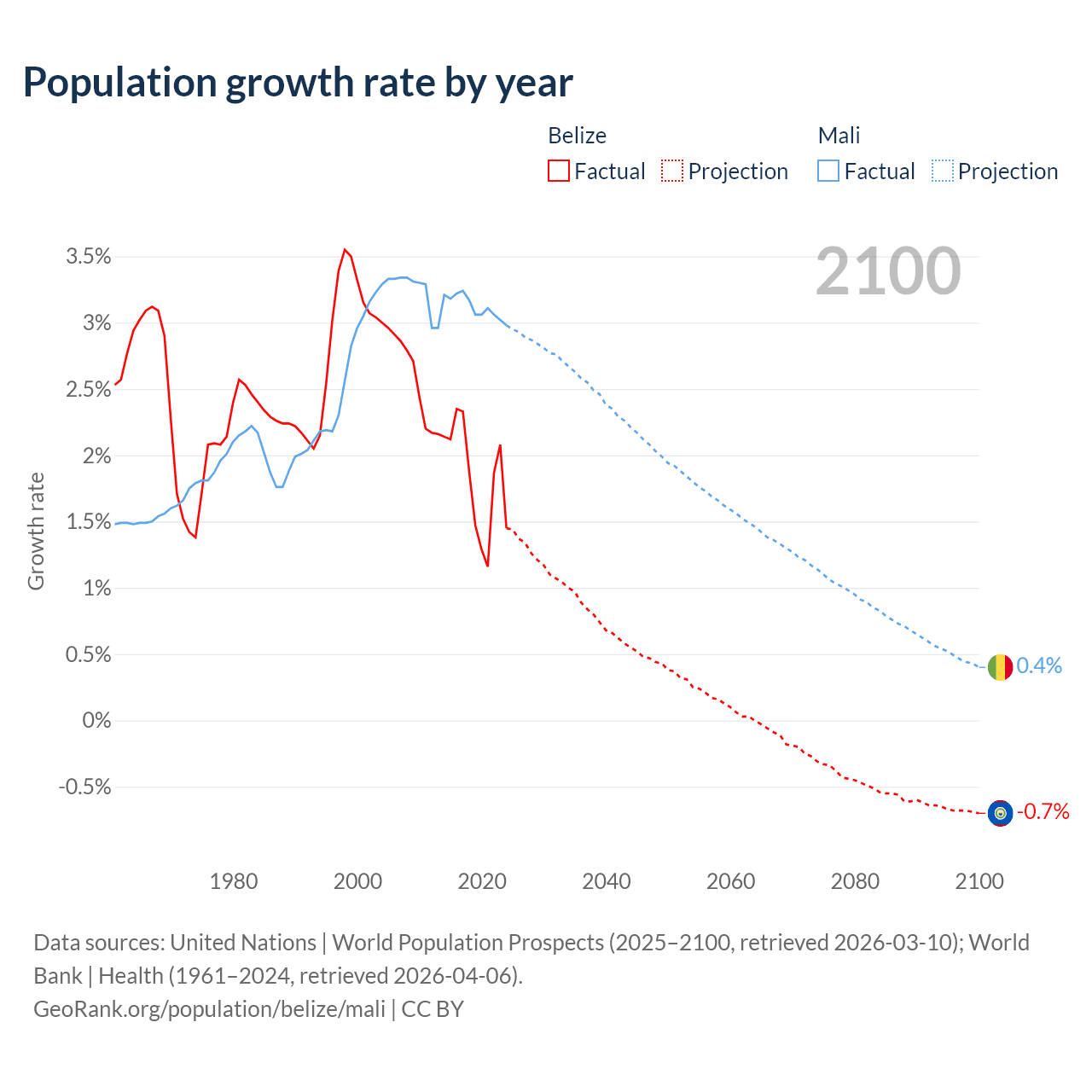 - For the last 10 years, Belize has had an average growth rate of +1.83% per year vs +3.12% in Mali.