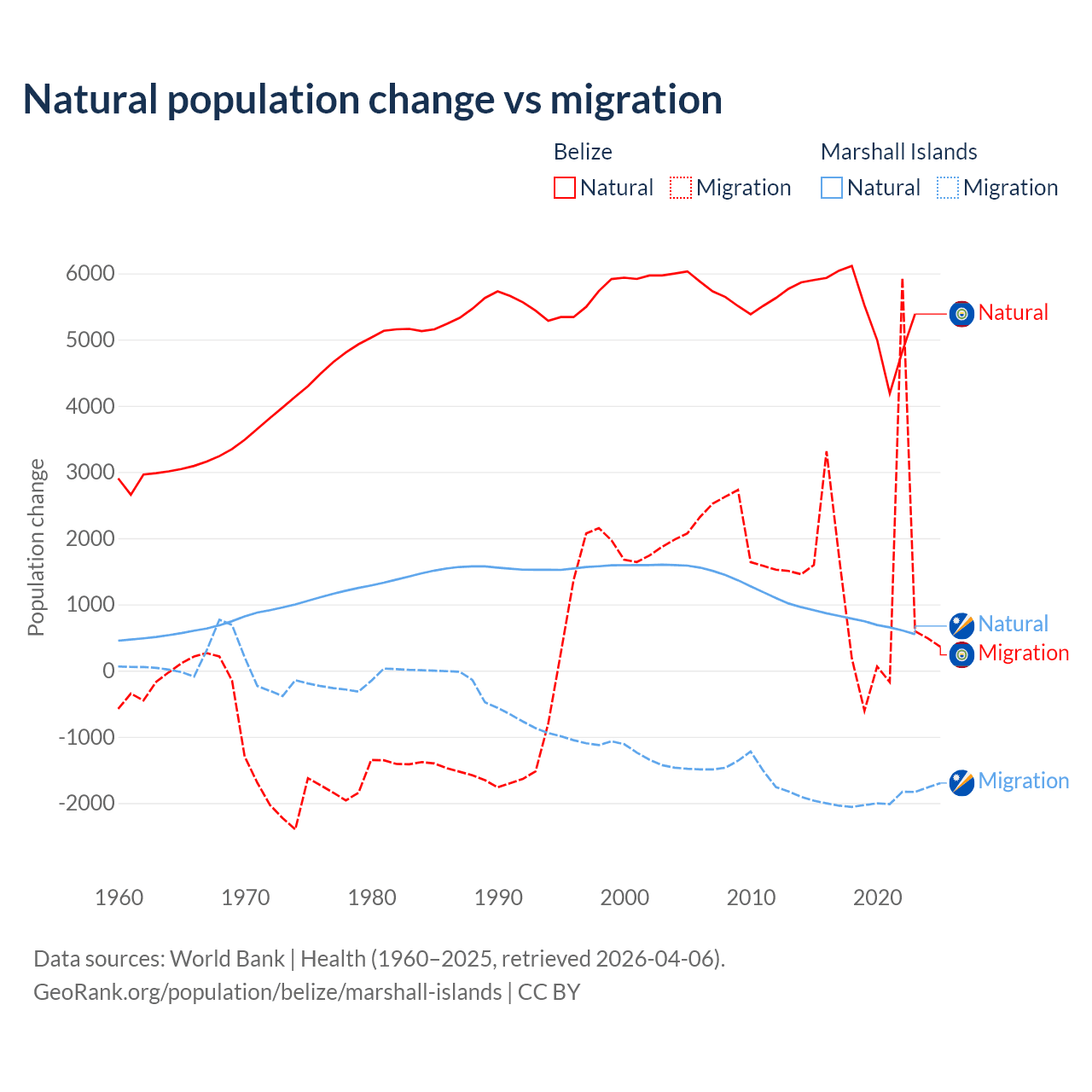 Over the last 10 years, 79.6% of the population change in Belize is from natural causes (a gain of 54,754 people) and 20.4% is from migration (a gain of 14,073 people). In the Marshall Islands 27.8% is from natural causes (a gain of 7,592 people) and 72.2% is from migration (a loss of 19,682 people).