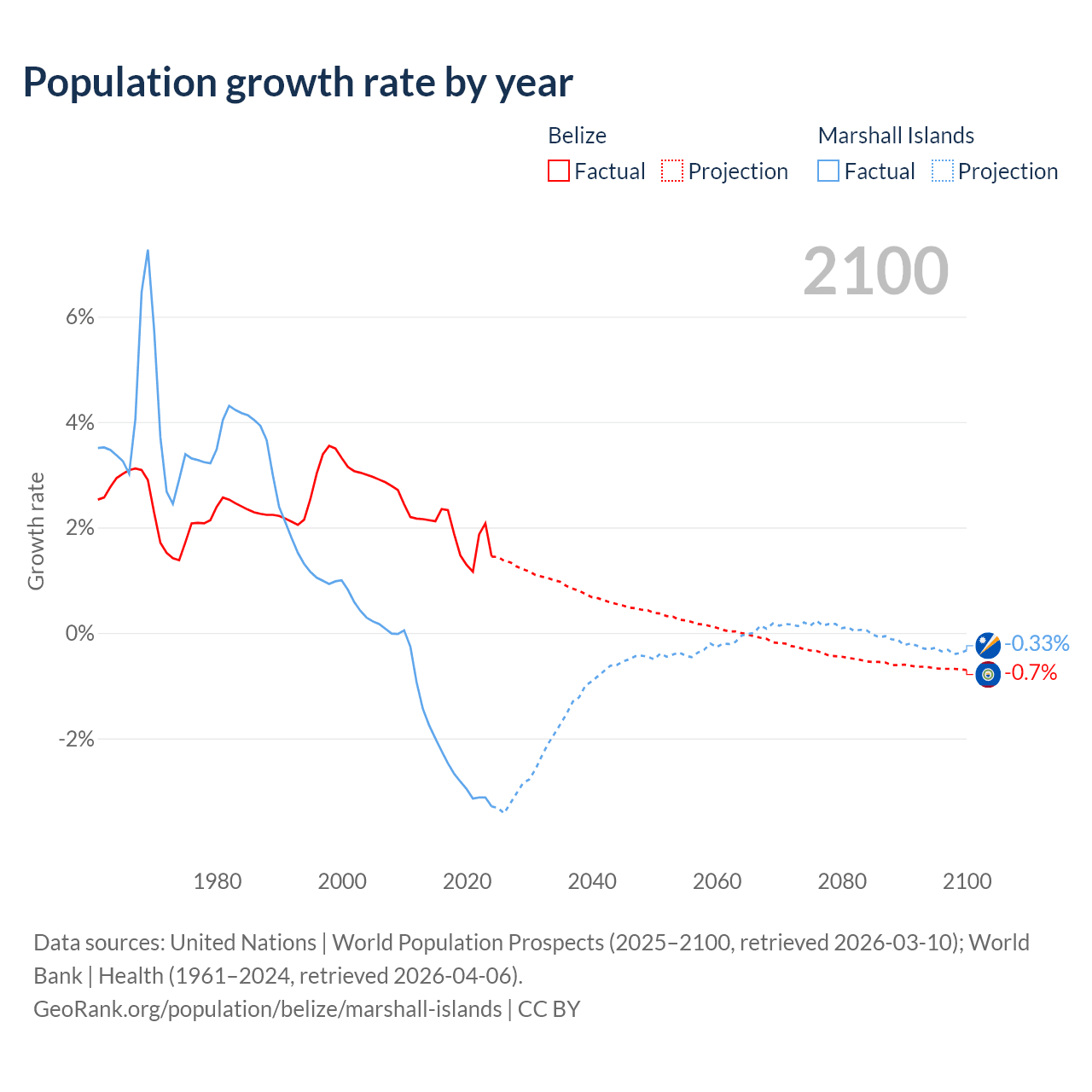 - For the last 10 years, Belize has had an average growth rate of +1.83% per year vs -2.69% in the Marshall Islands.